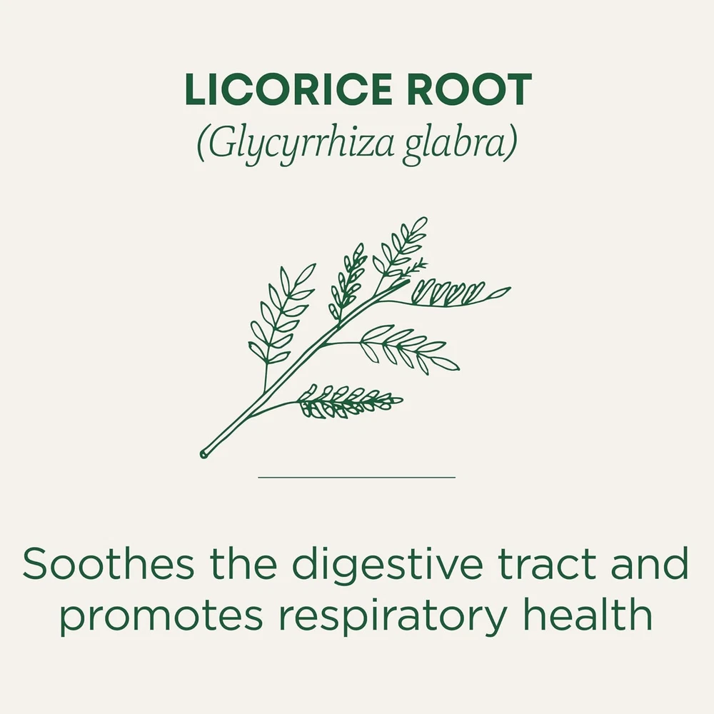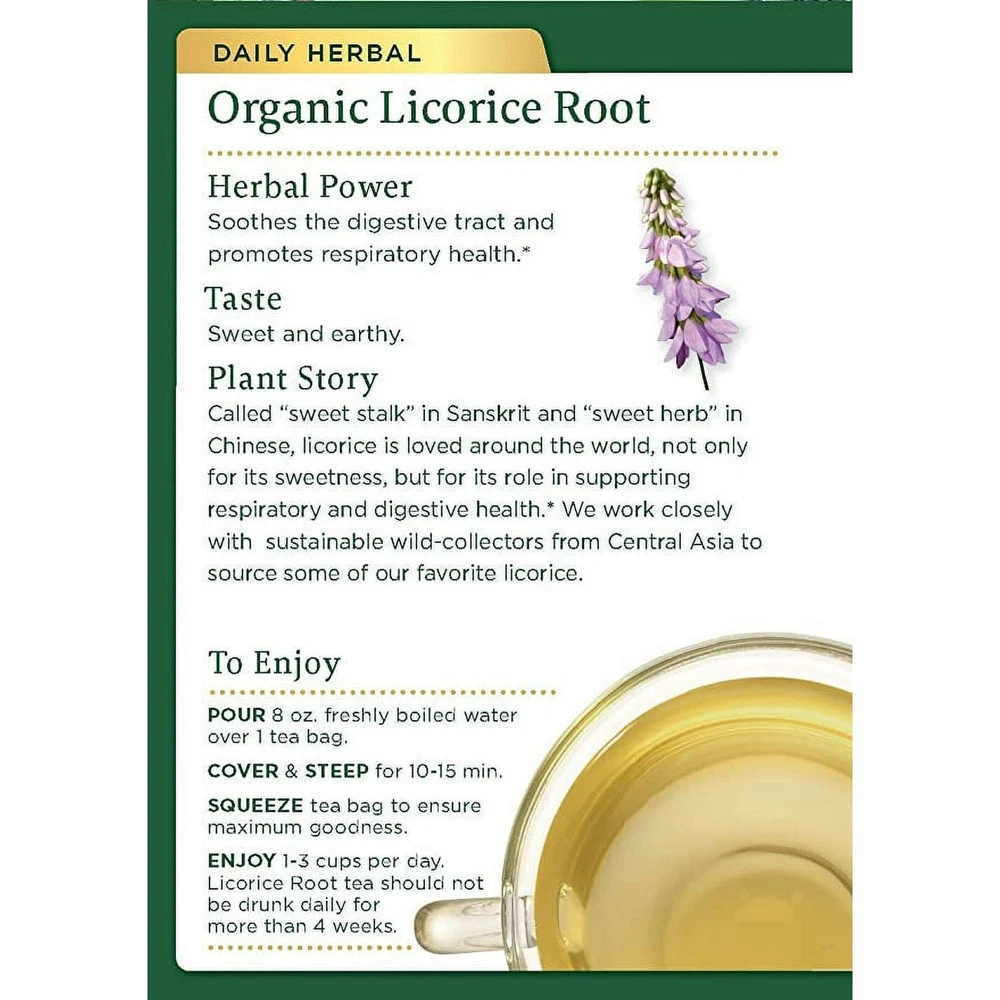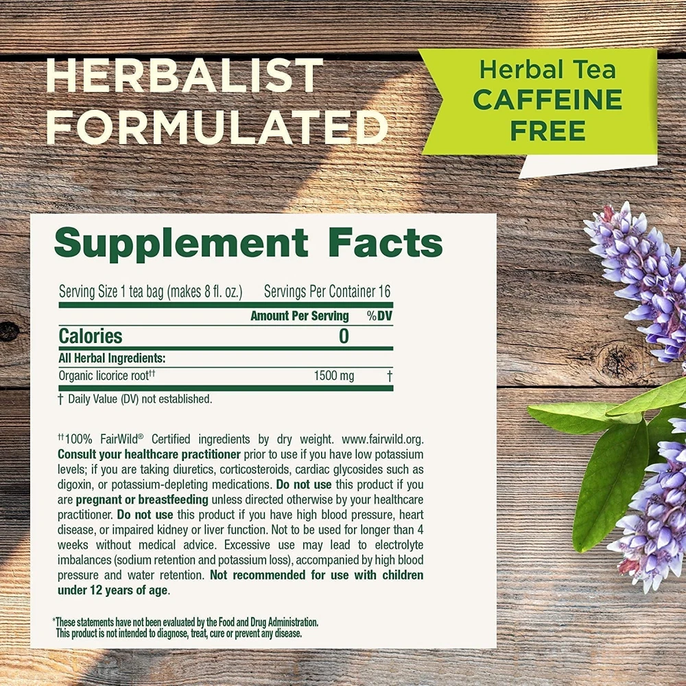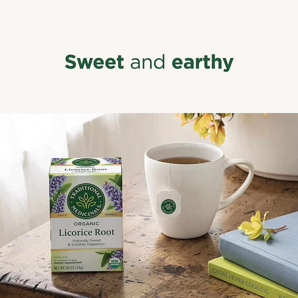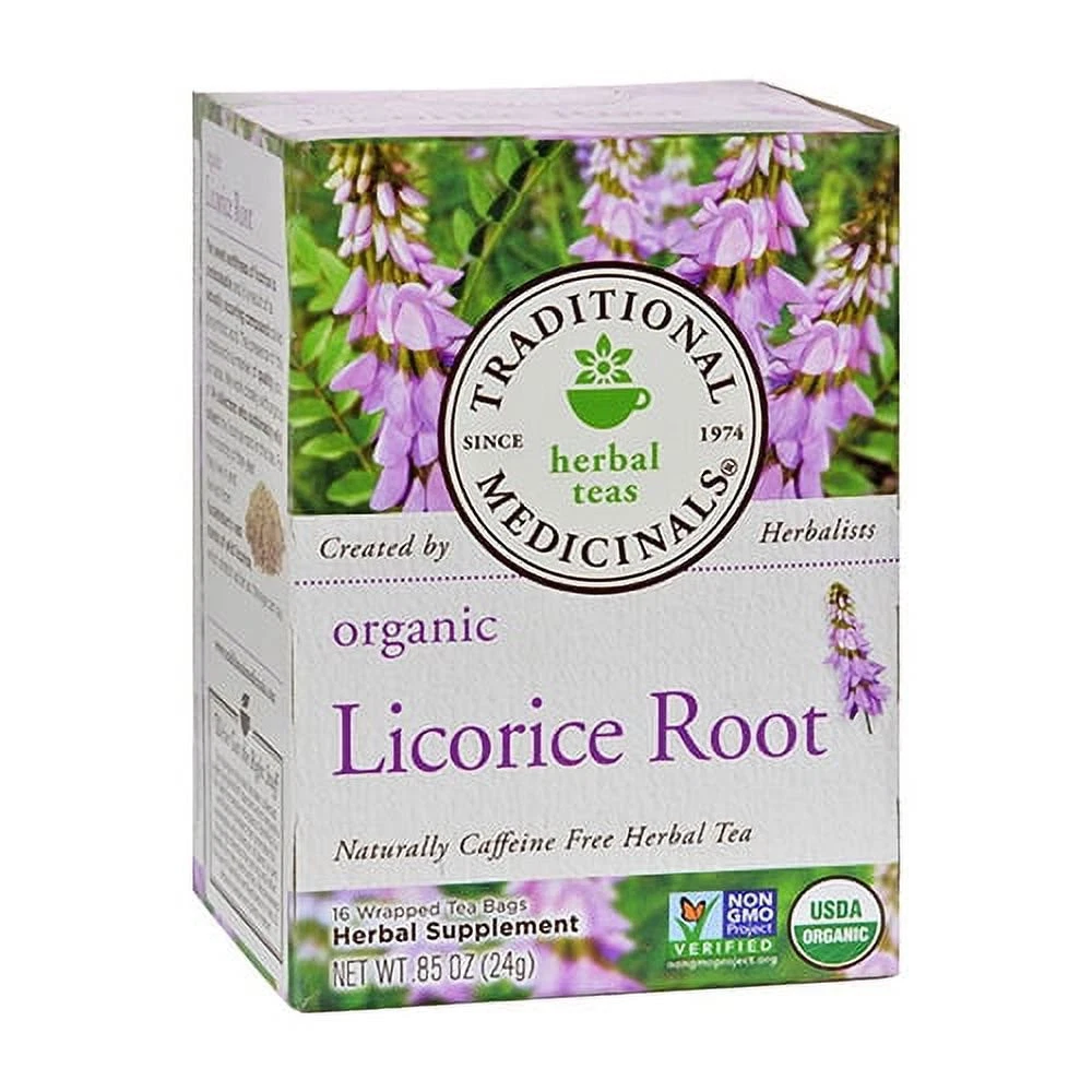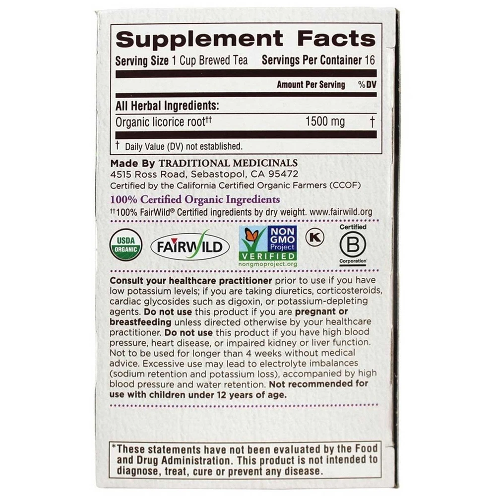 Product Description Traditional Medicinals Organic Licorice Root, Caffeine Free, Herbal Tea, 16 Count (Pack Of 1) Traditional Medicinals Tea, Organic Licorice Root, Herbal Tea Bags, 16 Count. Called “sweet stalk” in Sanskrit and “sweet herb” in Chinese, licorice is loved around the world, not only for its sweetness, but for its role in supporting respiratory and digestive health.* We work closely with sustainable wild-collectors from Central Asia to source some of our favorite licorice. From field to cup, we make sure our teas deliver the benefits of these amazing plants. To deliver consistently high-quality teas, we source organically farmed or organically wild-collected herbs from ethical trading partnerships, seeking out medicinal-grade plants. Only a small fraction of the world’s herb supply meets our high-quality standards. Herbal Power: Soothes the digestive tract and promotes respiratory health. Taste: Sweet and earthy. Plant Story: Called “sweet stalk” in Sanskrit and “sweet herb” in Chinese, licorice is loved around the world, not only for its sweetness, but for its role in supporting respiratory and digestive health. We work closely with sustainable wild-collectors from Central Asia to source some of our favorite licorice. The word licorice is actually a corrupted version of its original Greek name Glukurrhiza, which means, literally sweet root Called sweet stalk in Sanskrit and sweet herb in Chinese. Licorice is deeply loved around the world, not only for its signature, sweetness, but for its role in supporting respiratory and digestive health. Traditional Medicinals adore this earthy root tea because licorice is simply lovable and cant find a more shining example of everything that makes licorice fine. Herbal Power: Soothes the digestive tract and promotes respiratory health Taste: Sweet and earthy USDA Certified Organic, Non-GMO Verified, Kosher, Caffeine Free, Compostable Tea Bags, Herbalist-formulated Sustainability: First solar-powered and TRUE Zero Waste certified tea factory in the US. As a Certified B-corp, we prioritize and measure our environmental, social, and economic impact carton containing 16 individually wrapped tea bags Soothes the digestive tract and promotes respiratory health. Non-GMO Verified. All Ingredients Certified Organic. Kosher. FairWild Certified. Caffeine Free. Consistently high-quality herbs from ethical trading partnerships. Each box contains 16 sealed tea bags Taste: Sweet and earthy. May Soothe Digestive Tract May Promote Respiratory Health Sweet & Earthy Certified USDA Organic Non-GMO Project Verified Ingredients All Herbal Ingredients:,Organic licorice root 1,500 mg,100% FairWild Certified ingredients by dry weight.,prior to use if you have low potassium levels; if you are taking diuretics, corticosteroids, cardiac glycosides such as digoxin, or potassium-depleting agents. this product if you are unless directed otherwise by your healthcare practitioner. this product if you have high blood pressure, heart disease, or impaired kidney or liver function. Not to be used for longer than 4 weeks without medic Nutrition facts Refer to the product label for full dietary information, which may be available as an alternative product image. 16.0 Servings Per Container Serving Size 1 tea bag (makes 8 fl. oz.) Amount per serving Calories 0 Amount per serving % Daily Value* Total Fat 0g 0% Total Carbohydrate 0g 0% Protein 0g 0%