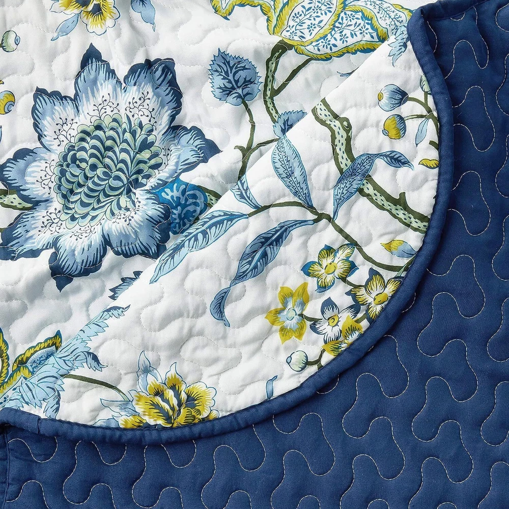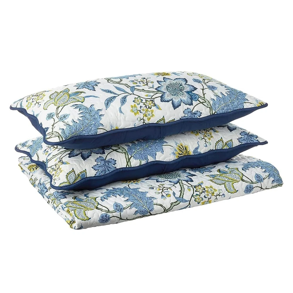 Breathe new life into your bedroom decor with the Traditions by Maldives 3-Piece Quilt Collection. This beautiful ensemble features an updated floral pattern in rich blues and greens on an ivory ground. Scalloped edges on the quilt and shams add charm and style. Set includes one quilt and two coordinating pillow shams. Full/Queen set measures 90" x 90" with two 20" x 26" shams. King set measures 104" x 90" with two 20" x 36" shams. Machine washable. Wash in cold water on the gentle cycle and tumble dry on low for long lasting beauty. Pillows are spot clean only. 100% Polyester. REVAMP YOUR BEDROOM - Experience the timeless glamour of the Traditions by Maldives Quilt Set. The stunning floral patterned quilt bedding set will add a touch of sophistication to any bedroom WRAP YOURSELF IN COMFORT - Ensure a cozy night's sleep every night with our all season quilt crafted from high-quality polyester. Made with fabric free from harmful substances and chemicals, our OEKO-TEX certified bedding set is a safe choice PERFECT SIZE - The Traditions Quilt Set delivers coziness, comfort, and style to your bedding. Our quilt set includes a generously sized quilt and two pillow shams for a cohesive look. Great for bedrooms, guest rooms or Airbnbs CONVENIENT CARE - Our quilt set is cozy and breathable even after washing. Machine wash this bedding set cold separately on a gentle cycle. Use only non-chlorine bleach when needed. Tumble dry low, remove promptly. Do not iron. Pillows are spot clean only TRUST - A renowned brand synonymous with elegance and quality, can help you upgrade your space with confidence. Embrace the delightful blend of style and comfort, and make your home a haven of relaxation and indulgence