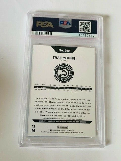 Absolutely awesome and highly collectible RARE Trae Young Rookie Card Hoops Teal Explosion short print graded PSA 10. VERY low population, POP 22. See all pictures for amazing condition, size, and detail. There are absolutely no returns on sports cards as the market for sports cards changes literally on a daily basis. Check out my store for some of the rarest vintage collectibles online from all eras. Thanks for looking and have a great day! :)