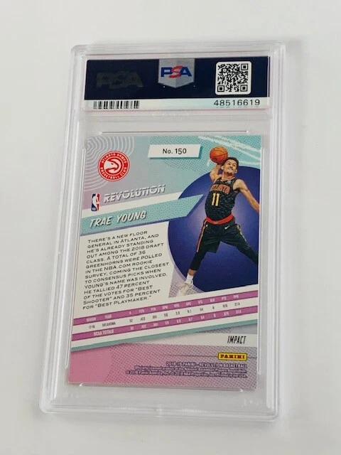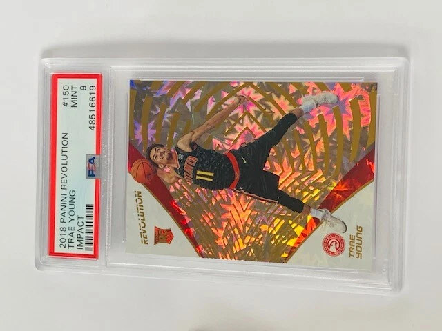 Absolutely awesome and highly collectible RARE Trae Young Rookie Card 2018 Panini Revolution IMPACT (less than 50 made) and graded a PSA 9 only 10 graded this high. See all pictures for amazing condition, size, and detail. No returns on sports cards as their value changes almost daily now. Check out my store for some of the rarest vintage collectibles online from all eras. Thanks for looking and have a great day! :)