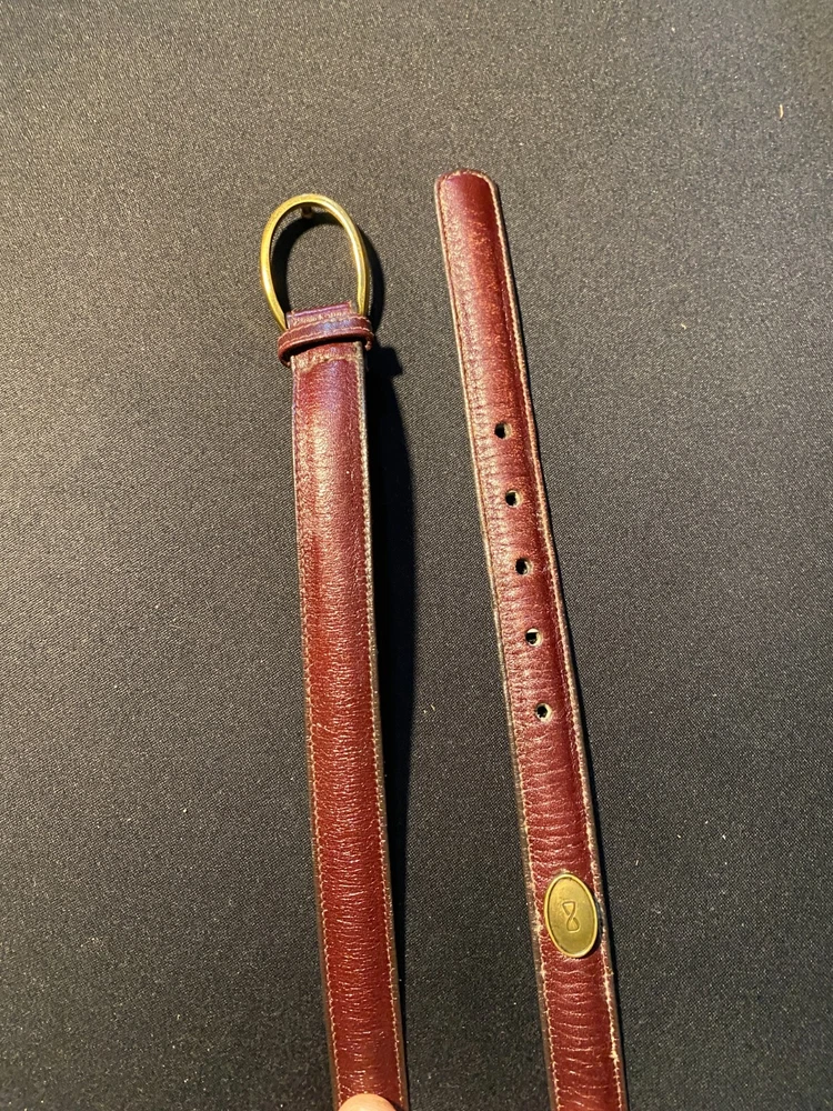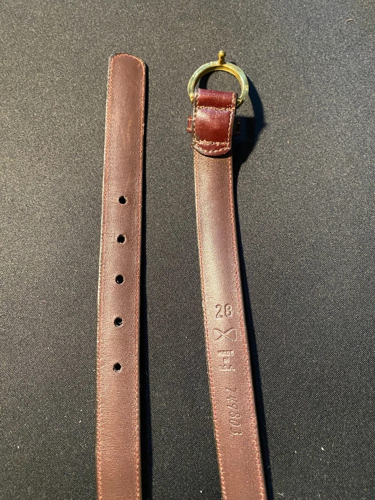 This Trafalgar belt is a vintage-inspired piece made of brown cowhide leather with a solid pattern. It features a brass buckle and is handmade with classic styling, making it suitable for both work and dress occasions. The belt is adjustable and comes in a size 32, perfect for men looking for a timeless accessory to add to their wardrobe.