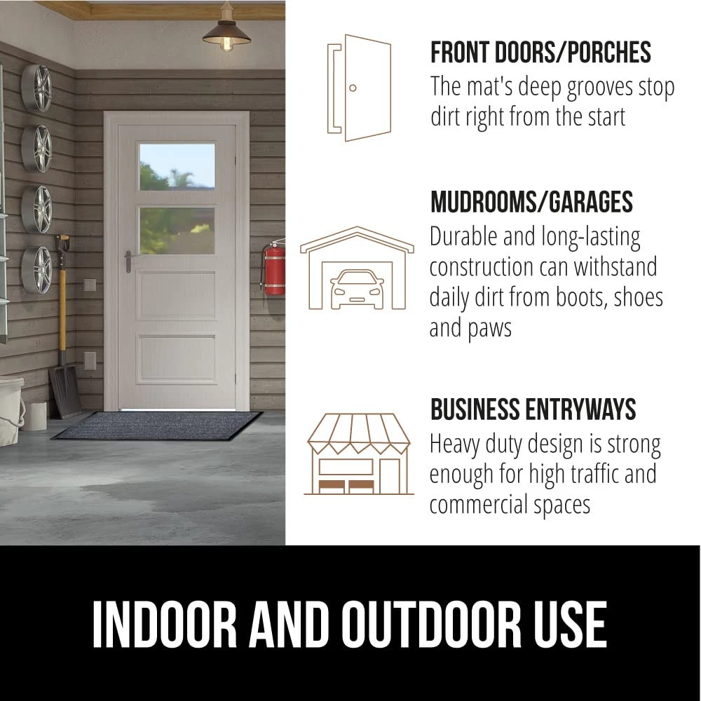 BUILT TOUGH FOR HIGH TRAFFIC: the Traffic Guard doormat is ultra strong and built tough to withstand high foot traffic; constructed with a high quality textured rubber backing and raised fabric topside to help scrape off dirt and debris; thick and plush topside is gentle on bare feet, but durable for boots WATERPROOF RIBBED TOPSIDE: ultra absorbent and 100% waterproof, the mat's surface helps to capture excess water and moisture; plus, premium fabric dries quickly and resists staining and fading for long lasting use DEEP GROOVES CAPTURE MUD AND MOISTURE: designed with a raised ribbed surface to help capture mud, dirt, moisture and debris deep within its grooves; perfect for those rainy and muddy days LOW PROFILE EASILY CLEARS DOORS: mat's low profile design measuring .25 inches thick allows nearly any low clearing door to pass over with ease INDOOR AND OUTDOOR USE: a great option for both indoors or out; mat's are extremely durable and can be used in a variety of locations at home or at work such as entryways, porches, patios, mudrooms, garages, and more; measuring 60 by 36 inches for a perfect fit