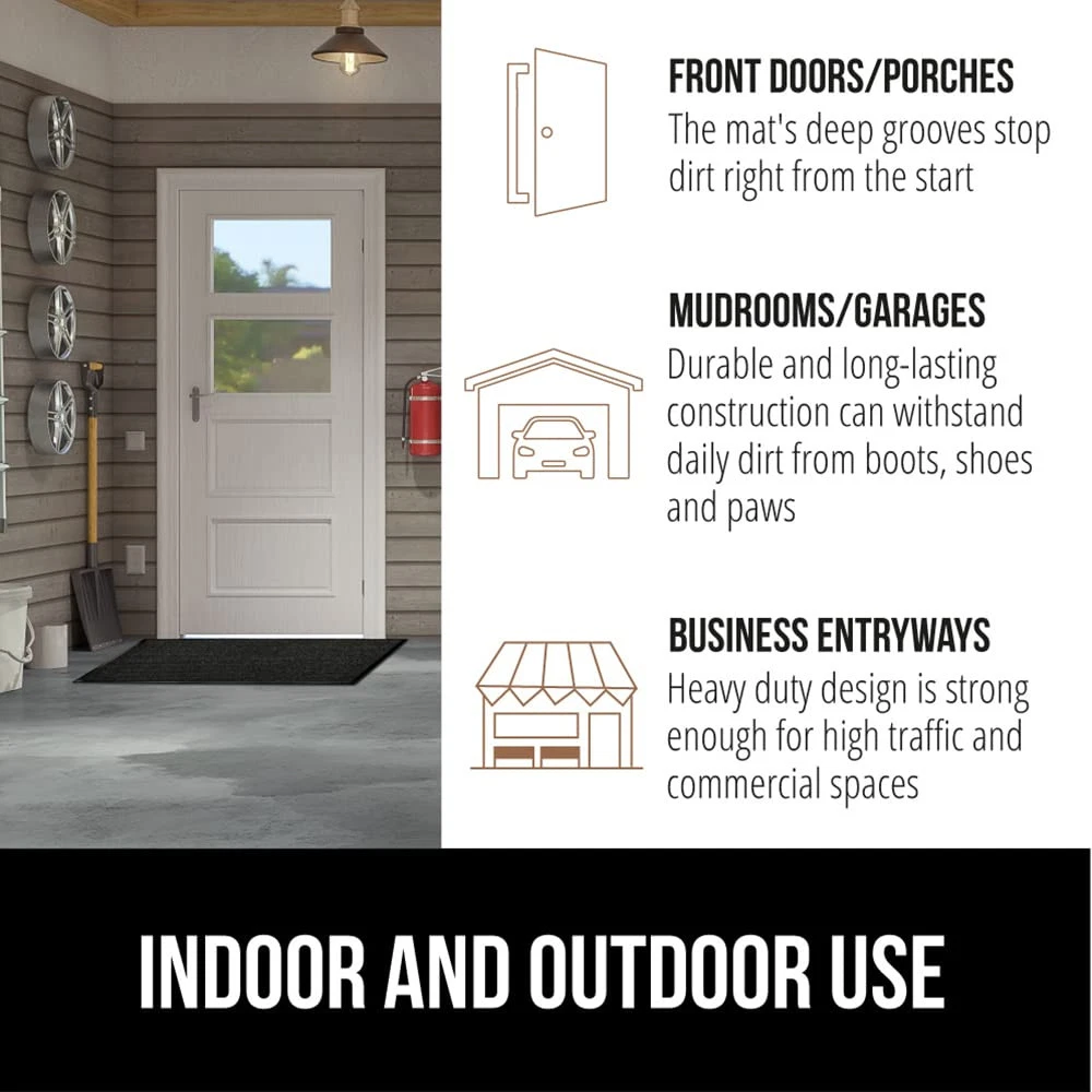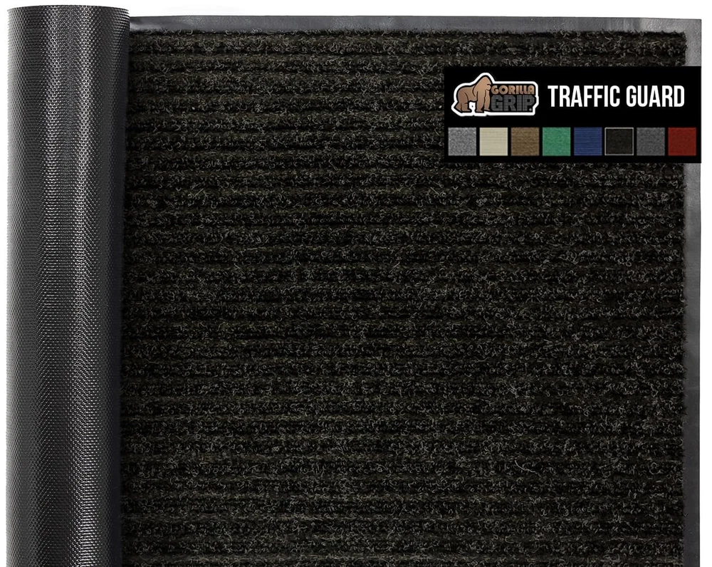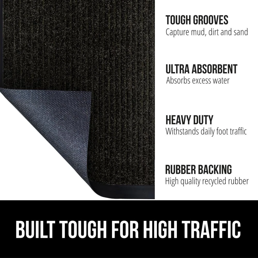 BUILT TOUGH FOR HIGH TRAFFIC: the Traffic Guard doormat is ultra strong and built tough to withstand high foot traffic; constructed with a high quality textured rubber backing and raised fabric topside to help scrape off dirt and debris; thick and plush topside is gentle on bare feet, but durable for boots WATERPROOF RIBBED TOPSIDE: ultra absorbent and 100% waterproof, the mat's surface helps to capture excess water and moisture; plus, premium fabric dries quickly and resists staining and fading for long lasting use DEEP GROOVES CAPTURE MUD AND MOISTURE: designed with a raised ribbed surface to help capture mud, dirt, moisture and debris deep within its grooves; perfect for those rainy and muddy days LOW PROFILE EASILY CLEARS DOORS: mat's low profile design measuring .25 inches thick allows nearly any low clearing door to pass over with ease INDOOR AND OUTDOOR USE: a great option for both indoors or out; mat's are extremely durable and can be used in a variety of locations at home or at work such as entryways, porches, patios, mudrooms, garages, and more; measuring 29 by 17 inches for a perfect fit