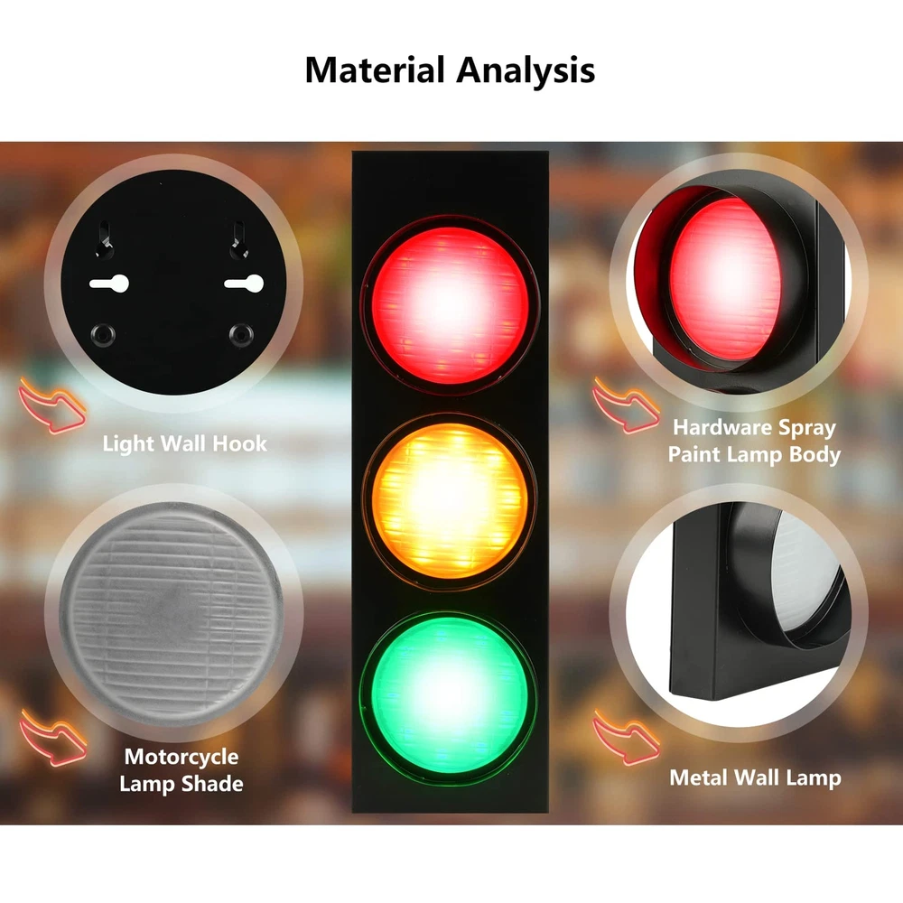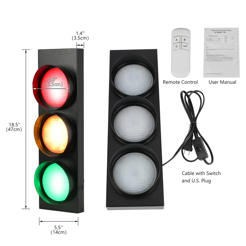 Description: LED Traffic Light Wall Decor Fun Wall Lamp with Remote Control For home decoration, holiday party decoration, decoration, gift, also suitable for kitchens, bedrooms, dining rooms, offices, bars and restaurants, etc. Specification: Mode: 4(red, yellow, green, red-yellow-green) Material: +Glass Item Size: 470*140(mm) / 18.5x5.5(inch) Power: 5W x 3 (total 15W) Voltage: 110-220(V) Package Dimension: 54*20*15cm/21.2*7.8*5.9inch Package Weight: 2.2kg/4.8lbs The package includes: 1 x Traffic Light Wall Lamp 1 x Remote Control 1 x Operation Description 1 x Install Accessories 🚥 Remote Control Led Decorative Wall Lamp: The traffic light lamp controlled by remote control is more convenient and intelligent; the lighting effect is divided into four types, red, yellow, green, red-yellow-green. Size: 470*140(mm) / 18.5x5.5(inch). Batteries are not included. The battery model for the remote control is 23A. 🚥 Frosted Glass Lampshade: The lampshade of the traffic signal light is made of frosted glass material, which has an elegant and high-end sense when it is not on. When the light is on, it highlights the mysterious industrial style, which is very creative. 🚥 Long Service Life: The average service life of this led wall light is up to 3000 hours, high-efficiency, high-brightness LED light source, wider viewing angle, frosted glass lampshade design, uniform light intensity distribution, adding a simple and elegant atmosphere to your residence. The power of 3 lamps is 5W x 3 (total 15W), the voltage is 110-220(V), and the cable is an American plug wire with a switch. 🚥 Fun & Room Decoration Light: This metal industrial style wall decor light is widely used in home decoration, holiday party decoration, decoration, gift, also suitable for kitchen, bedroom, dining room, office, bar and dining room, etc. 🚥 Easy installation: LED indoor wall light, can be installed horizontally or vertically, adopts integrated design, adopts wall-mounted type (including lamp wall hook), and the installation is very simple. Installation accessories and installation instructions are included in the package. Intelligent control circuit, overload protection current is stable, to ensure safe use.