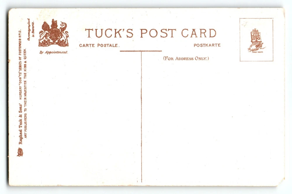 This vintage Valentine's Day postcard features a charming image of a seated boy in a sailor suit from Raphael Tuck & Sons' Nursery Don'ts series. The lithograph print is on standard size paper and has a divided back. The postcard is unposted and in its original condition, perfect for collectors of pre-war art and holiday memorabilia. The postcard is a single unit and comes from a set of 12. It was manufactured in Germany in 1908 and is an original print. The postcard is not signed and cannot be personalized. It would make a lovely addition to any collection of art, fantasy, or children's memorabilia. Unposted. Antique original vintage post card. Has torn off left corner, corner dings and age wear. Stock #val104. Additional postcards are in our store. Use cart to bundle and save. All post cards are old originals and may or may not have writing on back. Thanks for looking. Please check back soon for more great items.
