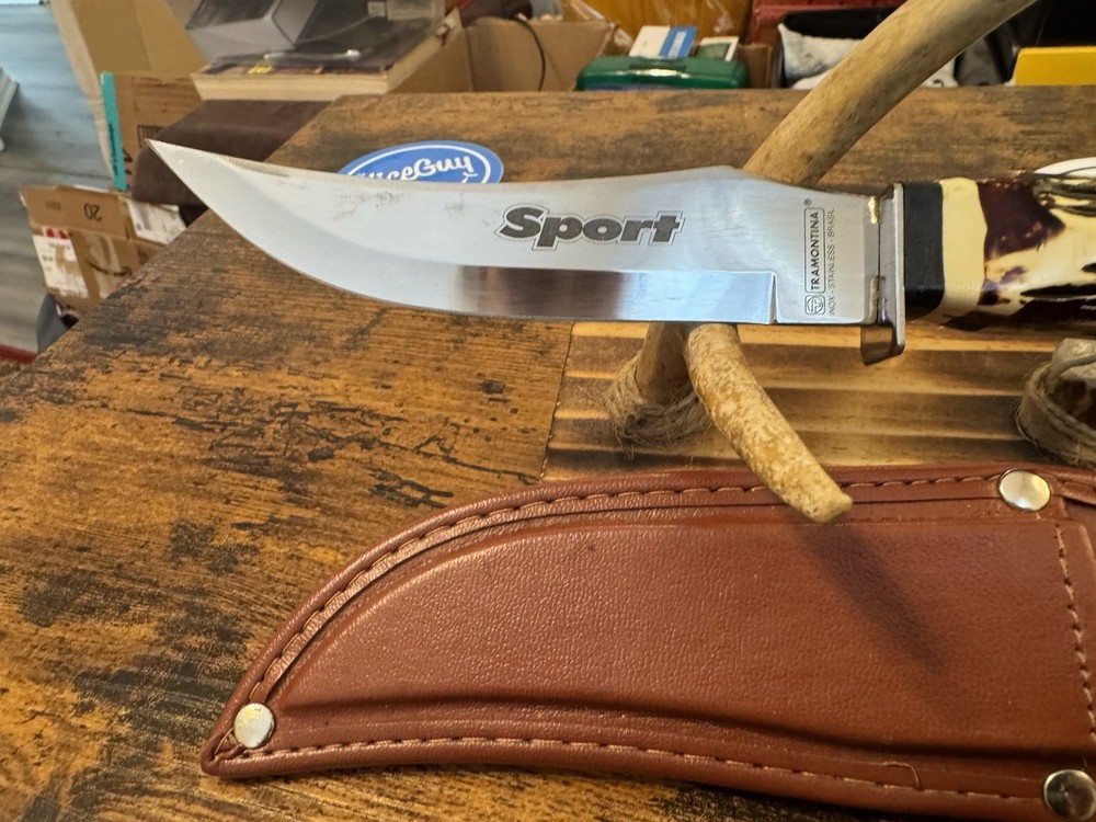The Tramontina SS Sport Hunting Knife is a high-quality hunting tool made in Brazil with a 5" stainless steel blade, perfect for outdoor enthusiasts. This straightback knife features a silver blade with a plain edge, ideal for hunting purposes. It comes with a sheath included for easy carry and storage. With its original design and durable stainless steel handle, this knife is a reliable and essential piece of equipment for any hunting expedition.