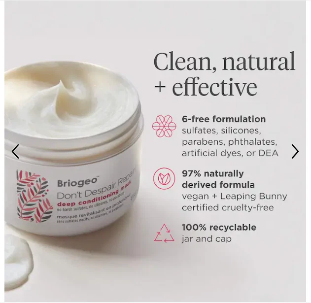 Brand: Briogeo Styling Effect: Hair Repair Ingredients: Argan Oil, Avocado Oil, Rosehip Oil Type: Hair Mask Volume: 8 oz/ 237 mL Size: Standard Size Hair Type: All Hair Types, Damaged Hair Features: Cruelty-Free/No Animal Testing, Paraben-Free, Vegan