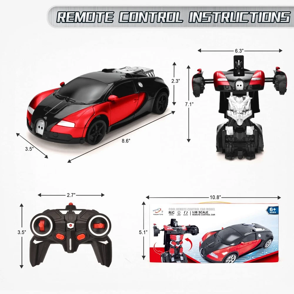 Give a surprise With more ways to play, keep young occupied for hours, help your develop their coordination, hand-eye combination,and the sense of direction. Controllable exciting sound, if you don't love the music, press the auto demo button about 3 seconds to turn on/off music. Transforming Robot Warrior Remote Control Sports Car 1/14 Scale Specifications: Robot Dimension: 9"(L) x 3"(W) x 10"(H) Car Dimension: 11"(L) x 5"(W) x 3"(H) Material: ABS Plastic Robot Battery Type: Rechargeable (included) Remote Battery Type: (2) AA (not included) Distance Control: 80-100 meters Run Time: about 35 min Recommended for ages: 6+ years Package Includes: 1 x RC Transform Car 1 x Remote Controller 1 x USB Charge Cable 1 x Rechargeable battery (Please charge for at least 8 hours for the first 2 times.) Warm Tips: 1.Please remove the batteries from the remote controller if not in use for a long time. 2.Requires 2 x AA batteries for remote controller (NOT INCLUDE). 3.The RC cars robot contains small parts, small age must play under adult supervision. 🚕Induction & button deformation: Interesting way to play.It can deform from car to robot when you press the button on the controller or with your hand to sense. Cruise down the streets in a drifting sports car or man the battlefield with an intergalactic robot. This will surprise the . 🚗Realistic RC Cars: Realistic Engine and acceleration sound. It has 5 smooth wheels and could Super Fast Drifting 360° turn in both robot and car. 🚓key auto demo: Controller toggles for forward, backward, left and right, button deformation, key auto demo - After pressing the demo button, accompanied by the exciting music, it will presenting you wonderful shows. ♻Safety: 100% harmless plastic and electronic elements. Car body with environmentally friendly anti-fall material, strong and resistant to fall, to deal with a variety of barbaric children's operation. 🎁Great Gift: 2.4Ghz Strong Transmitter system, dynamic music, creative rc cars for . Great as a birthday or festival gift. Keep your children away from computers, mobile phones, and TV, improve their coordination and thinking skills.