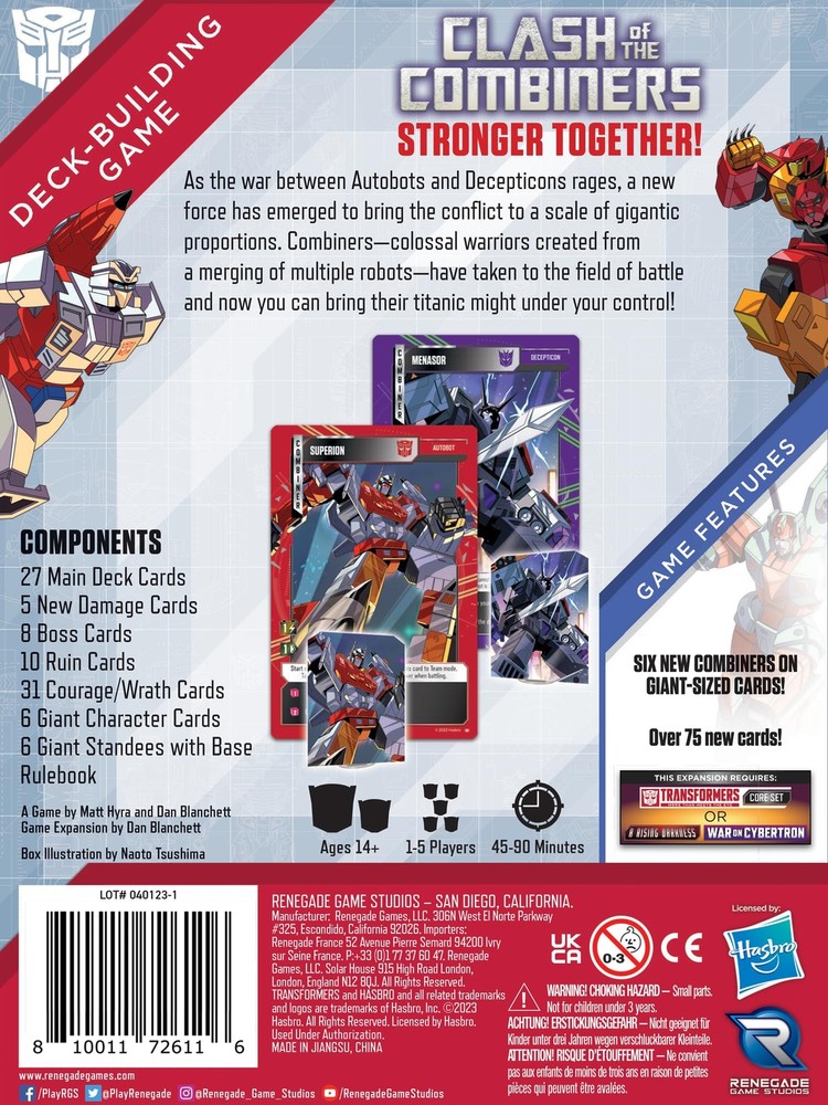 As the war between Autobots and Decepticons rages, a new force has emerged to bring the conflict to a scale of gigantic proportions. Combiners - colossal warriors created from a merging of multiple robots - have taken to the field of battle and now you can bring their titanic might under your control! This expansion pack features over seventy five new cards. Six new Combiners on giant -sized cards! A deck building game that is perfect for ages 14 and up, 1-5 players, and 45-90 minutes of fun. With the wara between Autobots and Deceptions takes place the conflict is emerged in gigantic proportions. Over 75 new cards! . Six new Combiners on GIANT-sized cards!. A new force has emerged to bring the conflict to a scale of gigantic proportions. Combiners - have taken to the field of battle and now you can bring their titanic might under your control! Perfect for ages 14 and up, 1-5 players, and 45-90 minutes of fun!