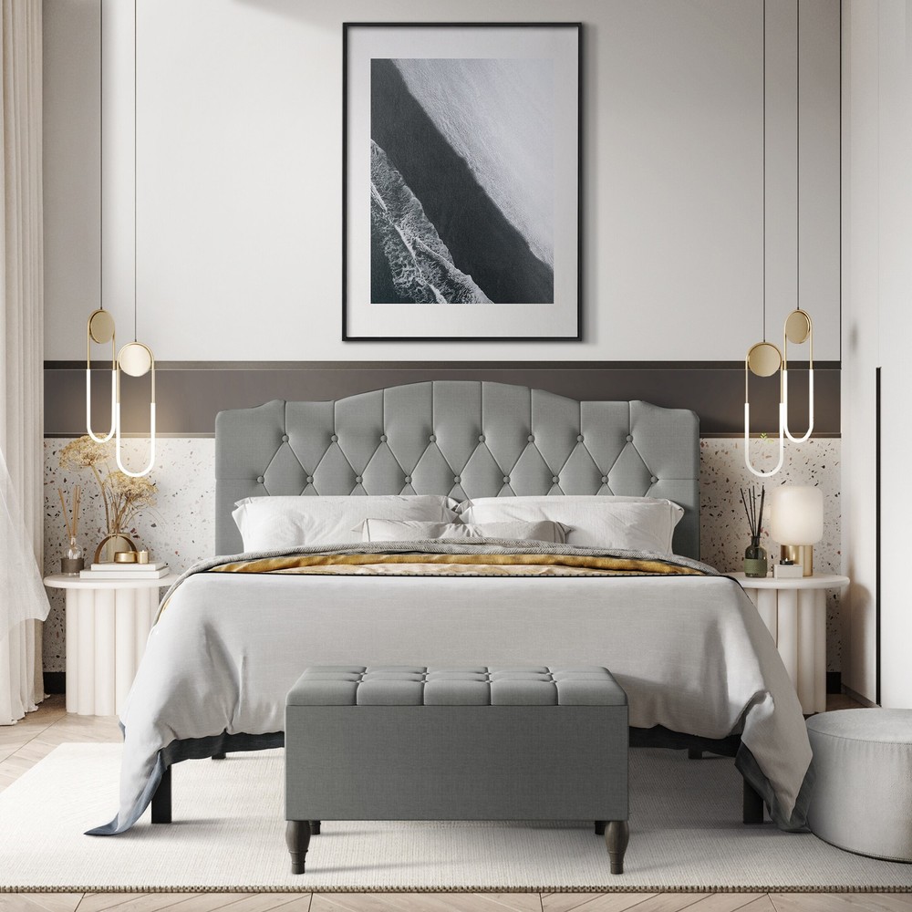 Bring modern elegance to your bedroom with our CraftPorch 2 Piece Bedroom Bench Set. The button-tufted headboard in soft linen fabric adds glamour and charm while the foam padding ensures extra comfort. This set includes a matching storage bench to keep your room clutter-free. Available in Twin, Full, Queen, and King sizes and three neutral colors (Warm grey, Light grey and Charcoal grey), the bed frame is made of solid wood, engineered woods, metal, foam, and polyester, and has a newly updated metal center support system for added durability.Product Features: Set includes 1 bed and 1 storage bench Button-tufted camelback silhouette headboard adds glamour and charm Bed frame comes with a storage bench with 4 solid wooden legs Available in 3 neutral colors: Warm grey, Light grey and Free Shipping Over $49.99* Details CraftPorch 2 Piece Bedroom Bench Set Transitional Button Tufted Bed Product Description: Bring modern elegance to your bedroom with our CraftPorch 2 Piece Bedroom Bench Set. The button-tufted headboard in soft linen fabric adds glamour and charm while the foam padding ensures extra comfort. This set includes a matching storage bench to keep your room clutter-free. Available in Twin, Full, Queen, and King sizes and three neutral colors (Warm grey, Light grey and Charcoal grey), the bed frame is made of solid wood, engineered woods, metal, foam, and polyester, and has a newly updated metal center support system for added durability. Product Features: Set includes 1 bed and 1 storage bench Button-tufted camelback silhouette headboard adds glamour and charm Bed frame comes with a storage bench with 4 solid wooden legs Available in 3 neutral colorsWarm grey, Light grey and Charcoal grey Ultra-soft linen fabric upholstery with soft foam for added comfort Made of solid wood, engineered woods, metal, foam, and polyester Newly updated metal center support system for added durability Solid metal side rails for additional support Requires a box spring or foundation (sold separately) Shipped in 1 box for convenience Holds up to 600-pound weight Backed by a 90-day limited warranty Easy assembly with included instructions Product Dimensions: Twin42.75 inches wide x 79.59 inches long x 49.65 inches high Full56.93 inches wide x 79.59 inches long x 49.65 inches high Queen63.24 inches wide x 84.71 inches long x 49.65 inches high King79.00 inches wide x 84.71 inches long x 49.65 inches high Bench18.32 inches wide x 29.55 inches long x 18.91 inches high Shipping Information: This product will ship to you in one (1) box for convenience and ease Assembly Information: Assembly is required, but easy-to-follow instructions are included NoteEssential assembly components may be concealed within the furniture (e.g. inside headboards). Please check all compartments, including zipped areas, to locate all parts before assembly. At CraftPorch®, we offers high-quality, affordable furniture that lets you express your unique personality. Infused with artistry elements and daring hues, our pieces inspire beautiful designs with a fresh twist on current trends. Based in Atlanta, Georgia, USA, we're dedicated to helping you create the home of your dreams. Whether you're drawn to mid-century modern, rustic farmhouse, contemporary or traditional styles, our diverse collections have got you covered.