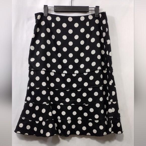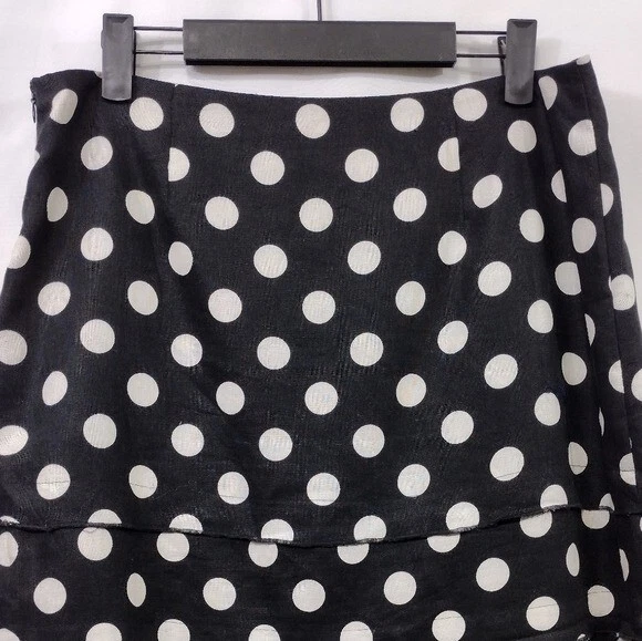 Chic and stylish polka dot skirt in classic black and white. Perfect for any occasion. Features Black White Polka dot Side zipper Tiered Lined A-line Boho Retro 90s Y2K 100% Linen Vintage Great Pre-Loved Condition SIZE 8 Measurements Pit to Pit: 16" Length: 26" Waist: Rise: Inseam: Length: Please check to be sure of fit Smoke Free Pets Free Please feel free to contact me for any questions or offer Bundle Discounts Offered Fast Shipping *50209-5773-25*