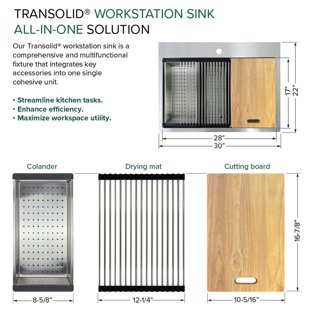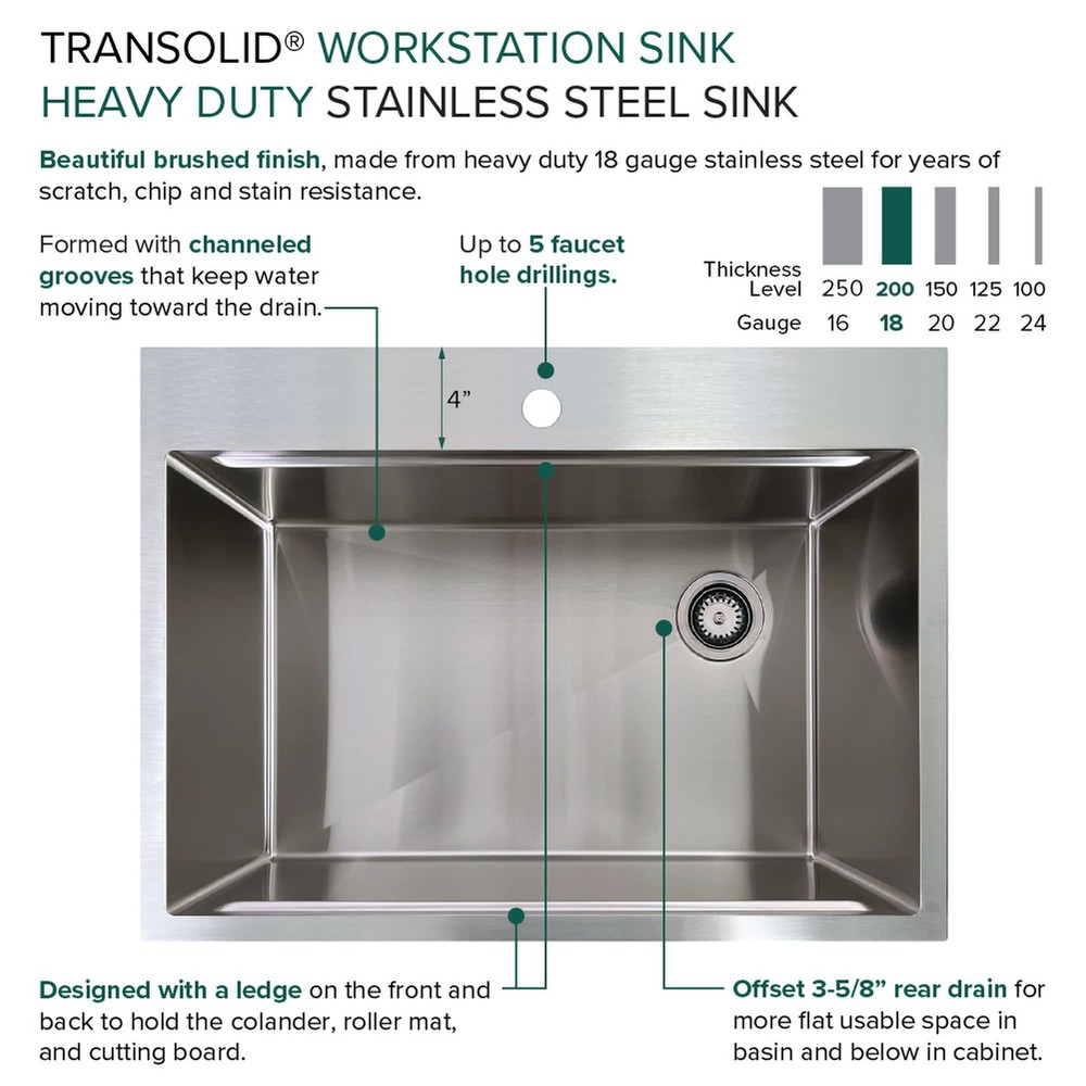 Powered by Frooition All Categories Transolid KWSST302210-ML2 30" Drop In Single Basin Stainless Steel Kitchen Sink with Basin Rack, Basket Strainer, Colander and Cutting Board Overview Item Description Transolid KWSST302210-ML2 Features: Covered under Transolid's limited lifetime warranty Constructed from 18 gauge stainless steel Drop in installation - sink will drop into a cutout in the countertop Single basin design for maximum work space Sound absorbent construction to prevent dish clatter and under cabinet condensation Sink comes pre-drilled with 2 faucet holes for faucets with 4-1/2" faucet centers Rear drain location increases available space under the sink Coordinates with products from the Workstation line All mounting hardware required for assembly is included Transolid KWSST302210-ML2 Specifications: Sink Length: 30" (left to right) Sink Width: 22" (front to back) Sink Height: 10" (top to bottom) Faucet Holes: 2 Faucet Hole Size: 2-1/2" Faucet Centers: 4-1/2" (distance between the installation holes for the faucet handles) Minimum Cabinet Size: 33" Drain Connection: 3-1/2" Why Choose BuildInc? OUR PROMISE TO YOU About Us At Build, we promise to provide the best selection we can, most competitive pricing, and unmatched customer service. Our store has quality home improvement products from trusted manufacturers like Moen, American Standard, Delta, Kraus, Kichler, Progress Lighting, Schlage, Kwikset, Baldwin, Broan, NuTone, Air King, and Rev-A-Shelf. With over 200,000 home improvement products for you to choose from, we have just what you need to get your project done. Fast & Free Shipping We promise to make it our priority to get you your items as fast as we can. We ship from 440 warehouses around the country, ensuring that your product will get to you as soon as possible. We know you're eager to get your hands on your new purchase, we would be too. As a bonus, most items ship for free. Returns We are happy to accept returns of unused or defective items for a refund within 30 days from the date of delivery. For returns outside 30 days, please contact our Customer Service team to go over our options. For full details, please view the Shipping and Payments tab above. To initiate a return simply go to the eBay Returns Portal and submit a return request. We ask that all items be returned with all original components via a traceable method. Once your return is received and processed, we will quickly get your refund or replacement issued. If for any reason you are unsatisfied with your purchase or for product or warranty questions, please contact Customer Service team for assistance. More Items! View more great items! About Us | Shipping | Returns | Contact Us | FAQ | Collections | Special Offers! Powered by Frooition Frooition Frooition | No-js Template | eBay design, eBay store design, eBay shop design, eBay template design, eBay listing design (ver:froo_no_js) This listing is currently undergoing maintenance, we apologize for any inconvenience caused.