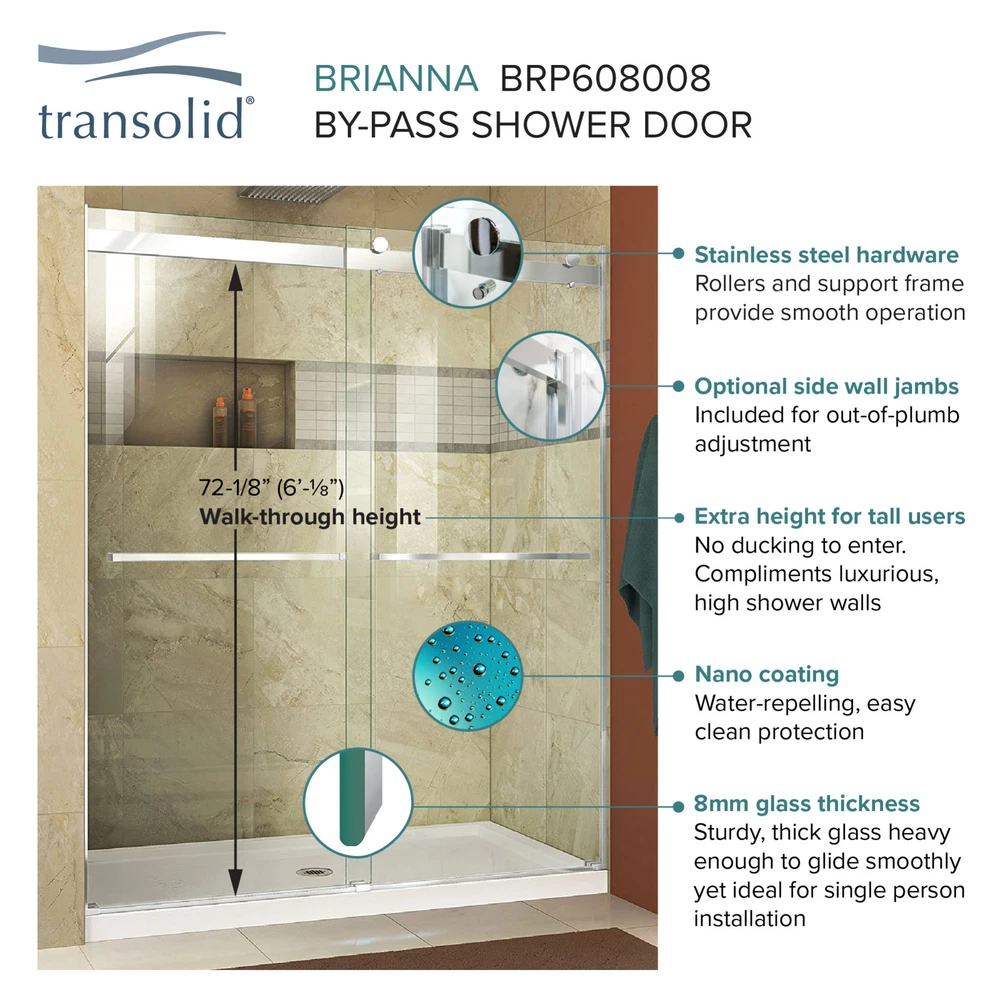 Powered by Frooition All Categories Transolid BRP488008F-J 80" High x 48" Wide Bypass Frameless Shower Door with Clear Glass Overview Item Description The Transolid Brianna Frameless Double Sliding Shower Door Collection offers an elegant, sophisticated look. It is available in several width and height combinations and features thick, premium 5/16 in. (8mm) frosted tempered glass with professionally applied Nano clear glass coating, which provides superior dirt and water repellant and stain resistant benefits. The Brianna door provides up to 3/8 in. of out-of-plumb adjustability on each side to provide a watertight fit in your alcove. The Brianna door is available in several desirable hardware finish options to match your bathroom's interior design and layout perfectly. Built for an alcove (3-wall) shower enclosure, sliding glass shower doors can be opened from left or right with its full by-pass (both panels slide) design. 20 in. (500 mm from center to center) sliding shower door handles also function as towel bars, providing handy storage space for a folded bath towel or two hand towels. Multiple Transolid handle options are available, but this combination features the Justin handles. The Justin handles feature a unique, high-end design, adding a distinctive look to your Brianna shower door. These handles are substantial in weight and are every bit as functional as they are beautiful. Look for the matching grab bar to complete the look! Transolid BRP488008F-J Features: Covered under Transolid's limited lifetime warranty and 1 year limited commercial warranty Constructed of durable 5/8" thick tempered glass and complemented by stainless steel profiles and guide rails Coordinates with products from the Brianna line A frameless design gives a modern, sleek look to the shower Bypass shower door operation acts as a space saver for smaller bathrooms Door opens to the left or right depending upon installation configuration All hardware required for installation of shower door is included This is a shower door only - a shower base and walls may be required to complete unit NOTE: The biggest challenge in selecting the correct shower door is determining the finished opening width - be sure your desired opening measures between the "Enclosure Width Range" note below Overall Height: 80" (bottom to top of door fixture) Why Choose BuildInc? OUR PROMISE TO YOU About Us At Build, we promise to provide the best selection we can, most competitive pricing, and unmatched customer service. Our store has quality home improvement products from trusted manufacturers like Moen, American Standard, Delta, Kraus, Kichler, Progress Lighting, Schlage, Kwikset, Baldwin, Broan, NuTone, Air King, and Rev-A-Shelf. With over 200,000 home improvement products for you to choose from, we have just what you need to get your project done. Fast & Free Shipping We promise to make it our priority to get you your items as fast as we can. We ship from 440 warehouses around the country, ensuring that your product will get to you as soon as possible. We know you're eager to get your hands on your new purchase, we would be too. As a bonus, most items ship for free. Returns We are happy to accept returns of unused or defective items for a refund within 30 days from the date of delivery. For returns outside 30 days, please contact our Customer Service team to go over our options. For full details, please view the Shipping and Payments tab above. To initiate a return simply go to the eBay Returns Portal and submit a return request. We ask that all items be returned with all original components via a traceable method. Once your return is received and processed, we will quickly get your refund or replacement issued. If for any reason you are unsatisfied with your purchase or for product or warranty questions, please contact Customer Service team for assistance. More Items! View more great items! About Us | Shipping | Returns | Contact Us | FAQ | Collections | Special Offers! Powered by Frooition Frooition Frooition | No-js Template | eBay design, eBay store design, eBay shop design, eBay template design, eBay listing design (ver:froo_no_js) This listing is currently undergoing maintenance, we apologize for any inconvenience caused.