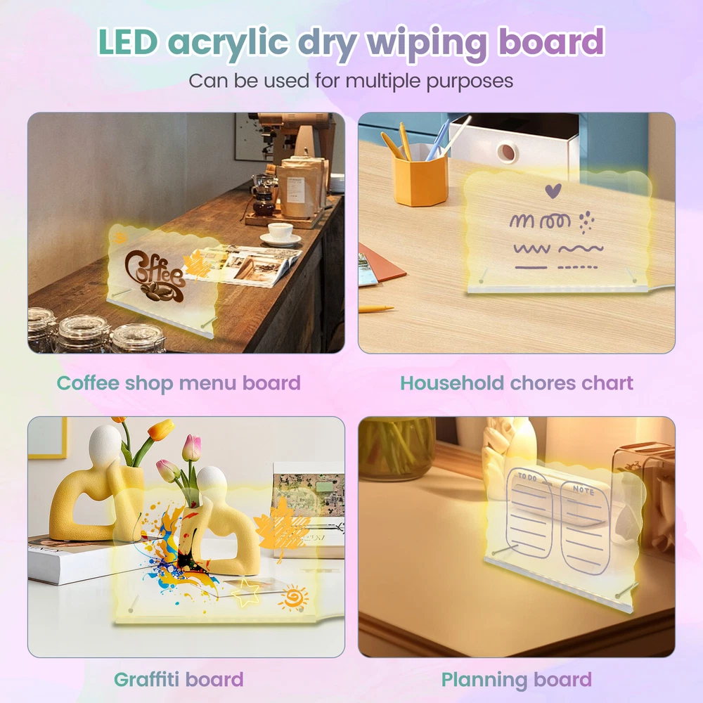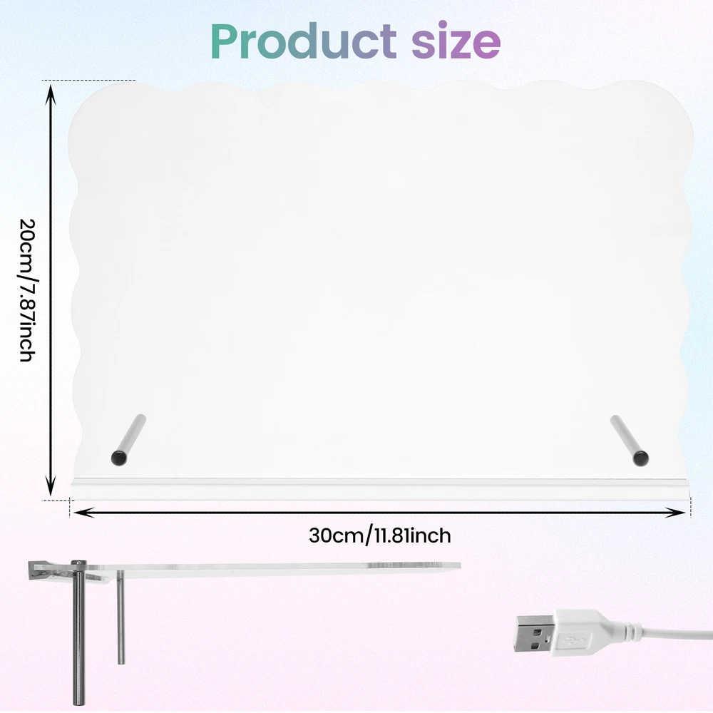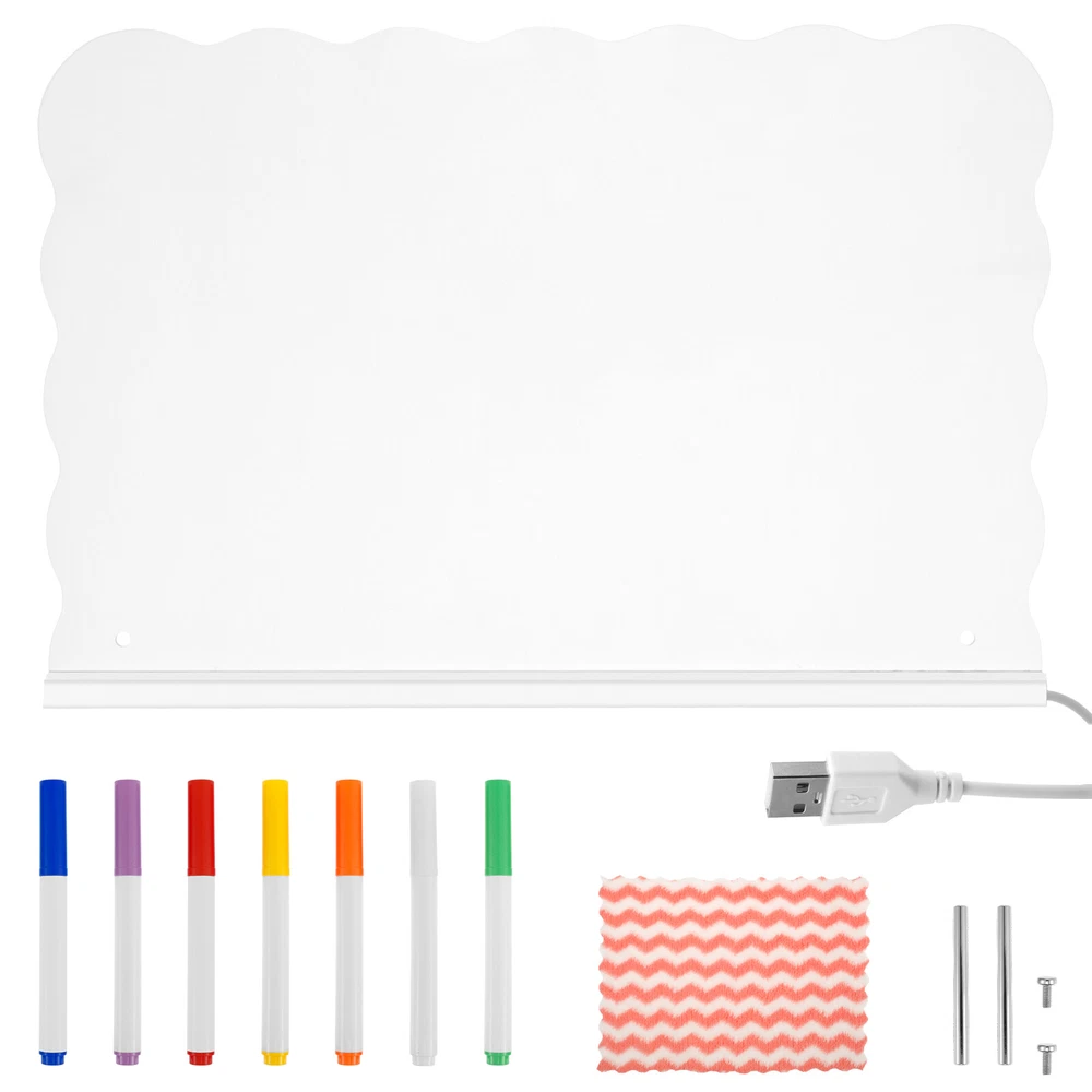 Parts List: 1 × Panel (connect USB cable) 7 × Pen (colour fixed green orange white yellow red blove purple) 1 × Wiping Cloth 2 × Thin Stick Holder 2 × Screw Highlight description: Versatile Message Board: LED acrylic dry erase board can turn a space into an orderly centrepiece. It can record reminders, to do lists, important dates, with reusable features and stylish design, it can better meet the daily record and decorative needs Easy to Use: The LED acrylic dry erase board has a clear, spacious surface for planning schedules and recording inspiration. With bright LED lights and a smooth writing surface, it helps users plan and organize their schedules to help them achieve their goals Accessory List: The acrylic board comes with a removable stand, 7 colours of pens and a dry erase cloth, all of which combine to provide users with the convenience they need for everyday writing and wiping Multi Purpose: The LED acrylic dry erase board can be used for various purposes, like coffee shop menu boards, household chore charts, etc., covering vision, doodling, drawing, planning, note taking and calendars, etc., which can meet the needs of different scenarios Suitable Gifts: LED acrylic dry erase board as a gift is quite distinctive and practical, suitable for birthdays, anniversaries, housewarming and other occasions, its design is elegant and generous, practical and convenient functions, can meet a variety of use requirements Detailed description: Description: When it's time to change the content, simply wipe gently with a dry cloth or paper towel, etc. to quickly and cleanly remove text and graphics from the board, making it easy to do new writing and drawing Key Feature: Acrylic fluorescent boards are lighter in weight and thinner in thickness, easy to carry and install, and can be moved at any time according to the need to move the position or change the display location Specification: Size: 30 × 20cm Texture: Acrylic Note: 1.There may be slight differences between the picture and the actual color of the commodity. We will try our best to show you the exact color. 2.Please allow slight dimension difference due to manual measurement.