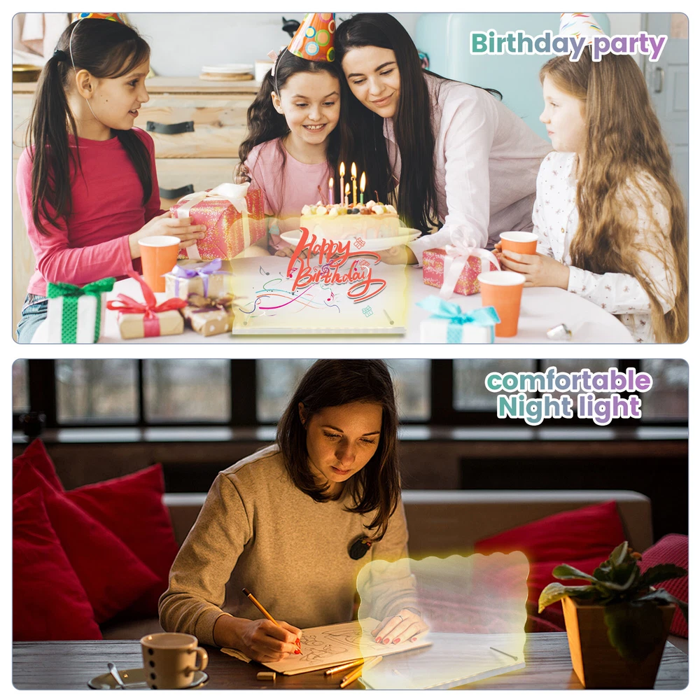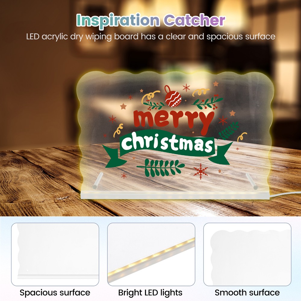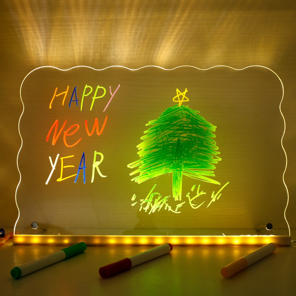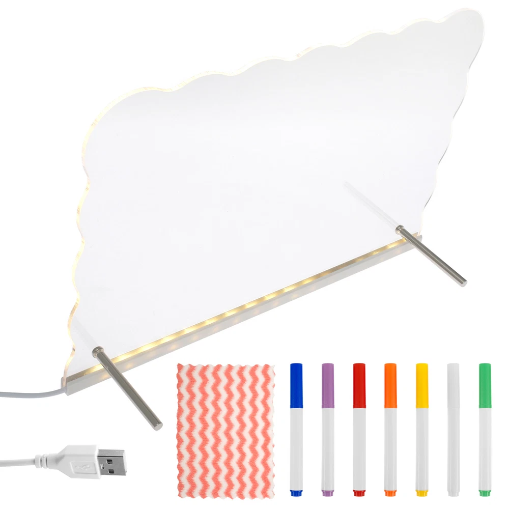 Parts List: 1 × Panel (connect USB cable) 7 × Pen (colour fixed green orange white yellow red blove purple) 1 × Wiping Cloth 2 × Thin Stick Holder 2 × Screw Highlight description: Versatile Message Board: LED acrylic dry erase board can turn a space into an orderly centrepiece. It can record reminders, to do lists, important dates, with reusable features and stylish design, it can better meet the daily record and decorative needs Easy to Use: The LED acrylic dry erase board has a clear, spacious surface for planning schedules and recording inspiration. With bright LED lights and a smooth writing surface, it helps users plan and organize their schedules to help them achieve their goals Accessory List: The acrylic board comes with a removable stand, 7 colours of pens and a dry erase cloth, all of which combine to provide users with the convenience they need for everyday writing and wiping Multi Purpose: The LED acrylic dry erase board can be used for various purposes, like coffee shop menu boards, household chore charts, etc., covering vision, doodling, drawing, planning, note taking and calendars, etc., which can meet the needs of different scenarios Suitable Gifts: LED acrylic dry erase board as a gift is quite distinctive and practical, suitable for birthdays, anniversaries, housewarming and other occasions, its design is elegant and generous, practical and convenient functions, can meet a variety of use requirements Detailed description: Description: When it's time to change the content, simply wipe gently with a dry cloth or paper towel, etc. to quickly and cleanly remove text and graphics from the board, making it easy to do new writing and drawing Key Feature: Acrylic fluorescent boards are lighter in weight and thinner in thickness, easy to carry and install, and can be moved at any time according to the need to move the position or change the display location Specification: Size: 30 × 20cm Texture: Acrylic Note: 1.There may be slight differences between the picture and the actual color of the commodity. We will try our best to show you the exact color. 2.Please allow slight dimension difference due to manual measurement.