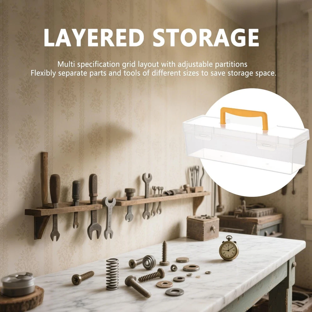 Tool Box with Transparent Lid Tool Box Hardware Storage Organizer Small Parts Product Description Bullet Points: Optimized Visibility: Reduces search time with transparent design for clear visibility, enabling quick tool identification and organized storage with our tool organizer box Adjustable Storage Space: Featuring modular storage and an adjustable layout, this organizer arranges tools by size to maximize space efficiency in any environment Sturdy PP Framework: Crafted from solid PP material, this organizer resists collisions and assists robust usage in various environments effortlessly with our small tool box organizer Effortless Portability: With its well-designed ergonomic handle assuring a secure and comfort-focused grip, this small parts organizer assists effortless single-handed movement, enhancing ease of transport across any workplace or environment effectively Multi-Purpose Fit: Designed to fit standard tools, such as screwdrivers and wrenches, assuring broad adaptability for organizing accessories in both home and workshop environments Transparent parts organizer case provides efficient storage for small items like screws, nuts, terminals, and beads. Ideal for garage, workbench, or craft areas, it keeps tools such as wrench, pliers, ratchet, marker, thread, fishing supplies, and electronics neatly divided. Product size: 12X10X36cm/4.72X3.94X14.17in Applicable people: general purpose Material: PP Capacity: 1500ml Storage scene: storage room Features: large capacity, transparent, wear-resistant, and drop-resistant Note: Due to different lighting and screen settings, the item color may be slightly different from the picture. Due to different manual measurements, please allow a 1-2cm difference in size. Product list: Tool box * 1 piece Payment 1.PayPal is a preferred Payment method. 2.You can make a Credit payment via Paypal.Paypal will let you use MasterCard,Visa to pay. 3.Payment should be completed within 3 days after auction closed, or unpaid dispute will be filed for an closing auction.An unpaid case will be filled after 4 days. Delivery details 1. We ship to many countries. 2. Delivery Time: Ship from China via Speedpak to US (takes 8-12 days) Ship from China via others shipping method to other countries (takes 15-60 days) 3. If you want to choose another address, please leave us a message on ebay.Please check your shipping address carefully before checkout,it can't be changed if order completed. Seriously promise:Refund or resend will be offered if item still not arrive in 7-10 business days. Just send us an email,we will give you a satisfied solution as soon as possible. Return policy 1.All item comes with Basic 3 Months Sellers Warranty, if item defective in 3 months,We will offer replacement without extra charger (including shipping fee) After we receive the defective item. If item Defective after 3 Month, Buyers can still send it back, We will contact suppliers or Manufactory for Warranty. Buyers Might Need pay the Shipping fee For resend the replaced item. 2.If item DOA(Dead of Arrival), Buyers can return it in 30 Days, we will replace it with new item after we receive DOA item. Please Contact us Before you sent the item back. 3.All item can be returned for exchange only. The buyer has responsibility for all return shipping including DOA or defective return. About Feedback When you receive the item and satisfied with the product, please leave positive feedback and 5 scores DSR. We will leave a 5 Scores DSR feedback for you. If, for any reason you are not satisfied with your purchase, please contact via Ebay Message and we will do our best to resolve it. Please don't leave neutral or negative feedback without any communition with .
