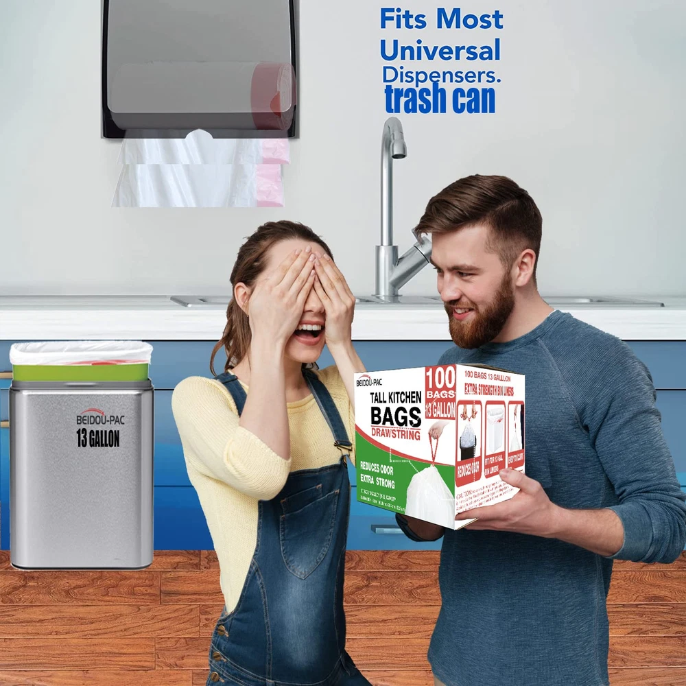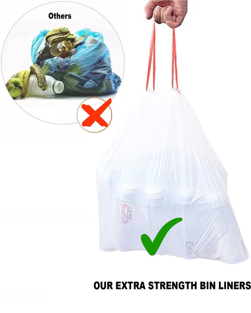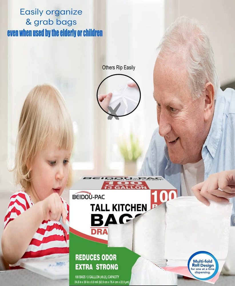 【ITEMS INFORMATION】Trash Bags 13 Gallon 24.8 inx 30 in x 0.9 mils 25 bags per roll 4 rolls Total 100pcs Our drawstring trash can liner is designed to fit perfectly in kitchen trash cans with a capacity of less than 13 gallons. Multi-fold roll trash bags design for at a time dispensing. Each trash bag pre-set seperated design Wrapped a roll in Handy dispenser packs can prevent rips and tears. No tears, More durable than other hand-tear models of easily broken garbage bags. Convenient drawstring handle, Extra-thick plastic and double-seam construction prevent rips and tears. Strong drawstring handles make the liners easy to lift, tie, and carry. Reduce Odor & Extra Strong,These kitchen garbage bags have a remarkably rugged build to accommodate all of your kitchen trash and tackles tough odors. large capacity enhances flexibility to expand around contents, so you can fit more trash inside each bag without straining or causing breakage. Innovative seals along the sides safeguard against leakage. Quickly tighten the drawstring to lock the stinky smell within the bag until you're ready to take out the trash. Drawstring Bags Ideal for More than Just Trash With their incredibly durable build, tall kitchen simple fit drawstring bags can be used for a lot more than kitchen trash. They're equally ideal for storing clothing for or donations as well as fantastic for use in office settings. With 100 bags per box, you'll never be in short supply!