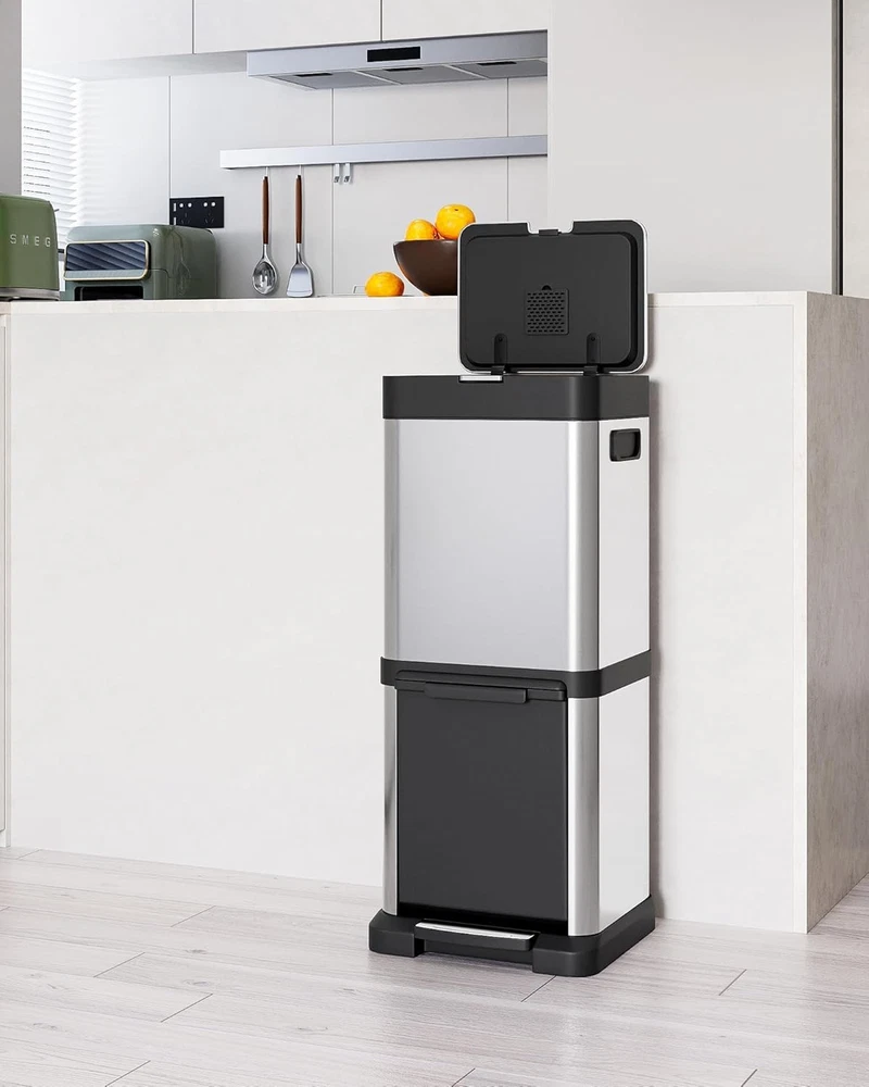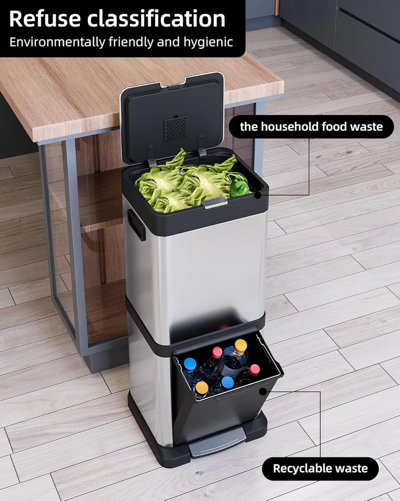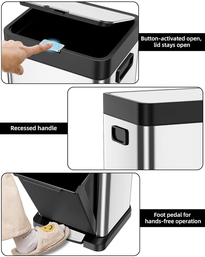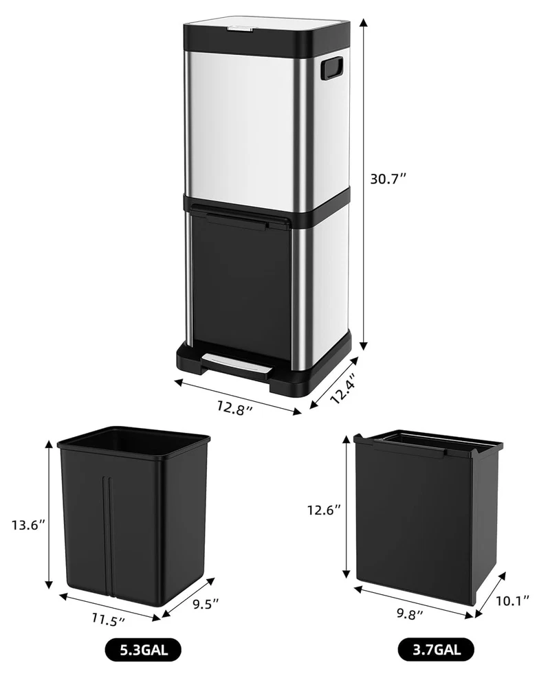 Trash Can 34L/9 Gal,5.3+3.7 Gal Dual Compartments Pedal Kitchen Recycling Trash Bin with Removable Buckets,Stainless Steel Garbage Can for Kitchen Bedroom [34L Capacity] The 34L/9 gallon is compact and suitable for places with limited space and lower waste generation, such as kitchen corners, bathrooms, or small offices. [Dual Compartments Bin] The 2-compartment trash can simplifies waste sorting, making it easy to separate recyclables from general waste, which promotes eco-friendly practices and encourages responsible disposal. [Odor Seal] The lid of the trash can effectively prevents odors from escaping, keeps pests out, maintains a tidy appearance, and supports efficient waste sorting [Hand Free] This stainless steel trash can features a foot-operated lid, allowing users to open it without touching the body, reducing odor leak and maintaining hand hygiene. The foot pedal frees up your hands, making disposing of trash more convenient, especially during busy times [Easy to maintain] The Stainless steel trash cans are highly advantageous due to their corrosion resistance, durability, and easy cleaning. They resist rust and wear, ensuring long-lasting use, while their smooth surface allows for quick sanitation. Overall, they are a practical and stylish choice for any environment