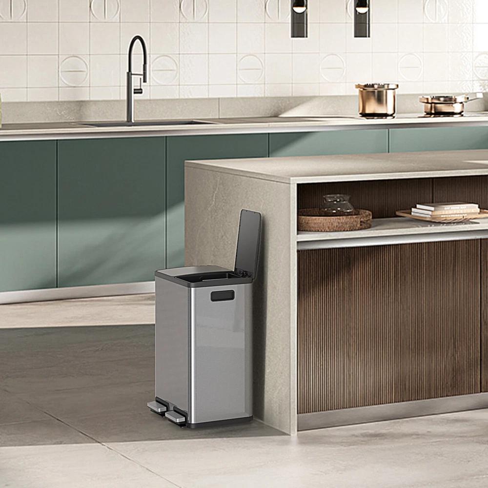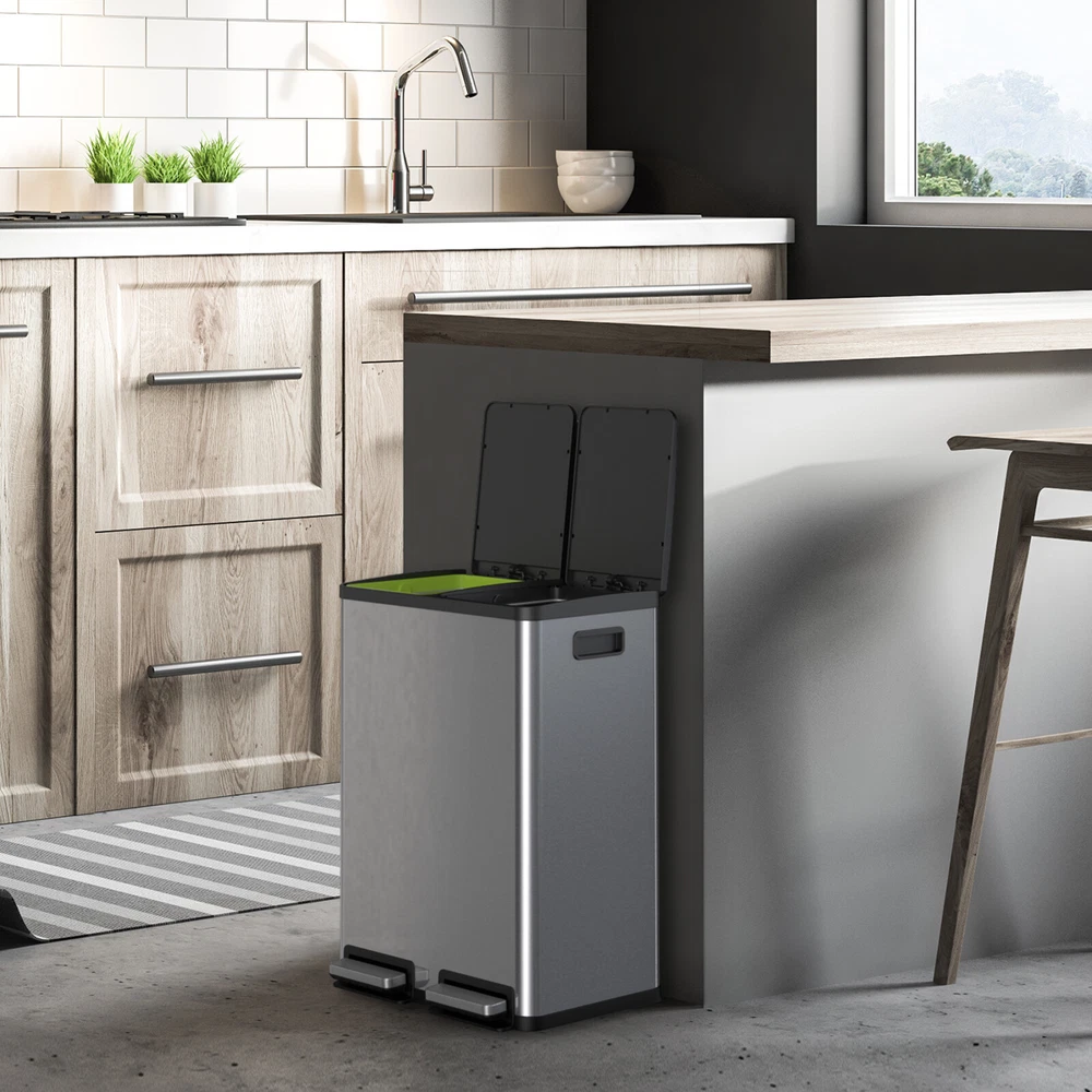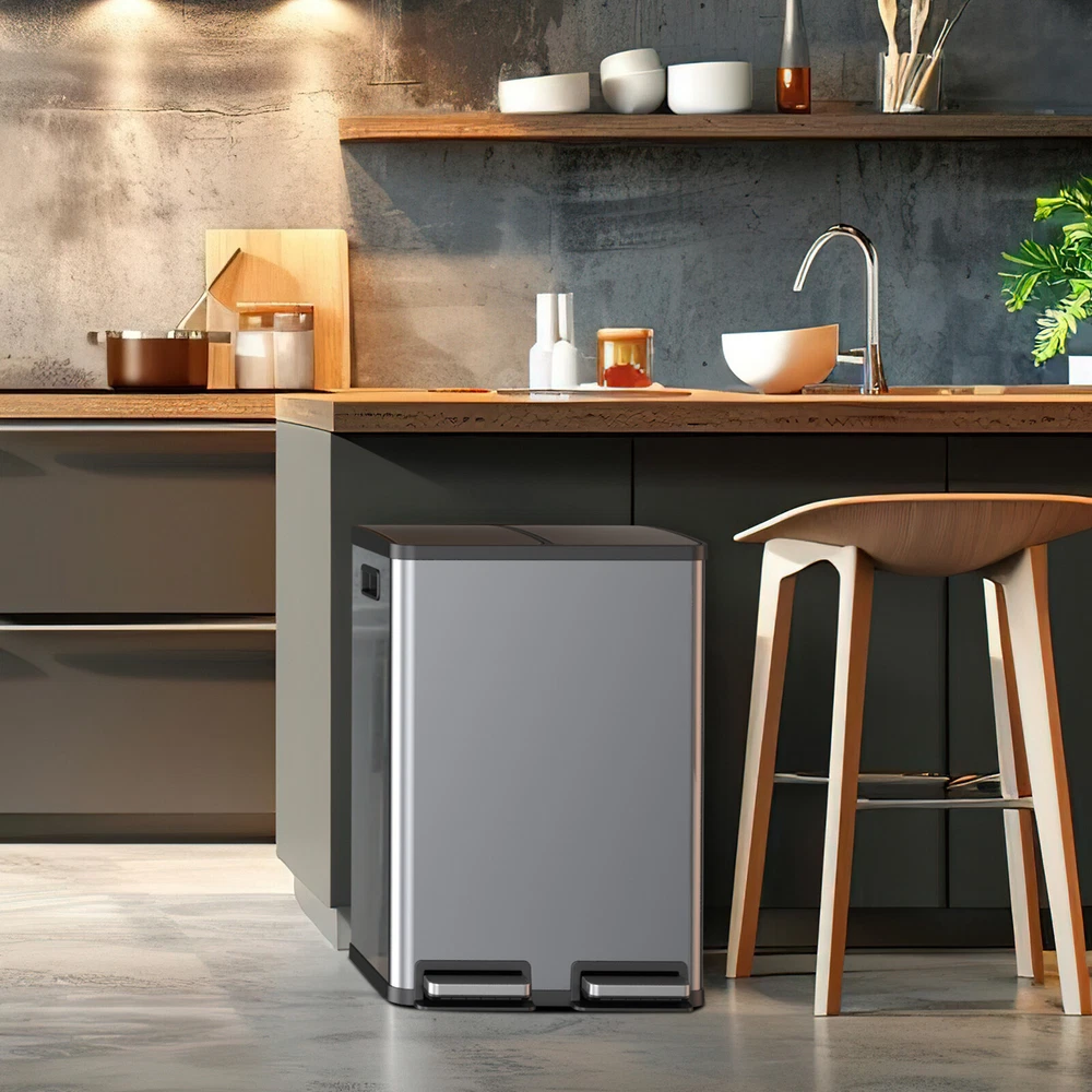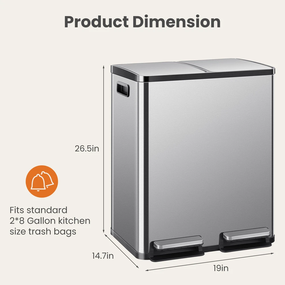Trash Can 60L Stainless Steel Waste Bin with Lid Foot Pedal 2 Compartment Home