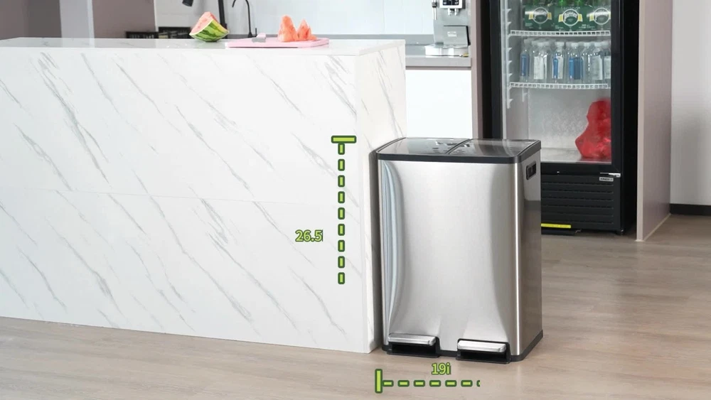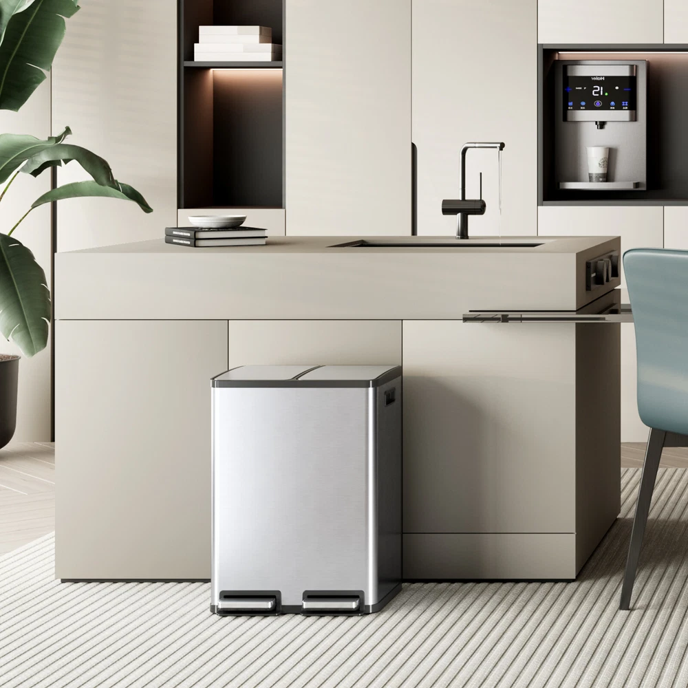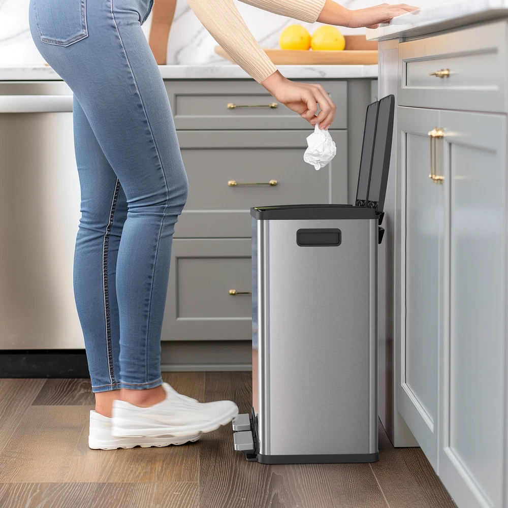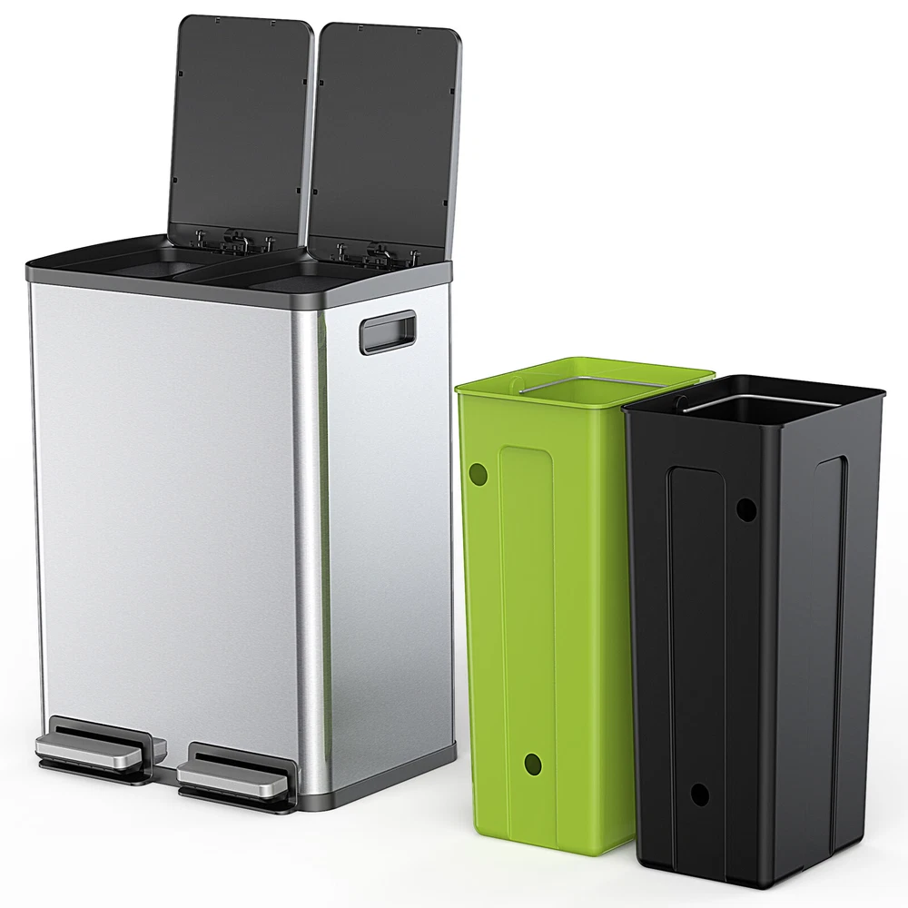 Trash Can 60L Stainless Steel Waste Bin with Lid Foot Pedal 2 Compartment Home