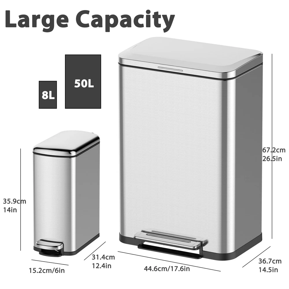 Trash Can Set 2 Pack, 13 Gal Stainless Steel Trash Can With Lid, Step On Waste Bins, 2 Gal Slim Trash Can for Narrow Space Trash Can Set - Our trash can combo value set solve both your kitchen and bathroom needs in one time, keeping your space tidy. The larger trash can 13 Gal is suitable for kitchen, living room and office, while the smaller trash can 2.1 Gal is suitable for narrow spaces thanks to its slim shape. Stainless Steel Trash Can - This trash can set is made of high quality stainless steel and thickened plastic inner buckets, sturdy and durable. All inner buckets are removable. Polished surface finish is fingerprint-proof and resists smudges, keeping trash can set shiny and easy to clean. Simple but Useful Design - This trash can has a rectangular shape so that it has spacious storage capacity than the circular can. Simple appearance matches perfectly with your modern home. Silent Close Lid - Our kitchen trash can use slow down technology, open and close will not make a lot of noise. Please rest assured that you can use it with no worry about disturbing your families break. Strong Steel Pedal - The steel pedal has experienced hundreds of test before sending to you, durable and strong. If you have any questions, please feel free to contact us.