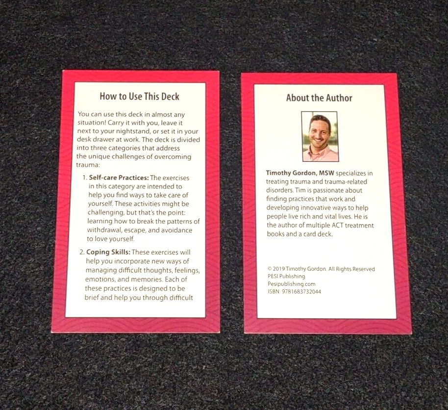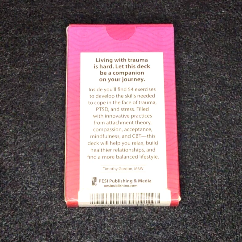 Intended Audience: Ages 9-12, Young Adults, Adults Narrative Type: Nonfiction Format: Cards Author: Timothy Gordon MSW Seller Notes: “Normal wear and tear on box from use and storage but the cards are perfect” Language: English Publication Year: 2019 Topic: Bereavement, Coping with Illness, Mental Exercise, Mental Health, Personal Development, Self-Esteem, Self-Help, Self-Improvement, Therapy, Trauma Type: Activity Book Features: Flashcards Personalized: No Book Title: Coping Skills for Trauma Deck Genre: Psychology & Help