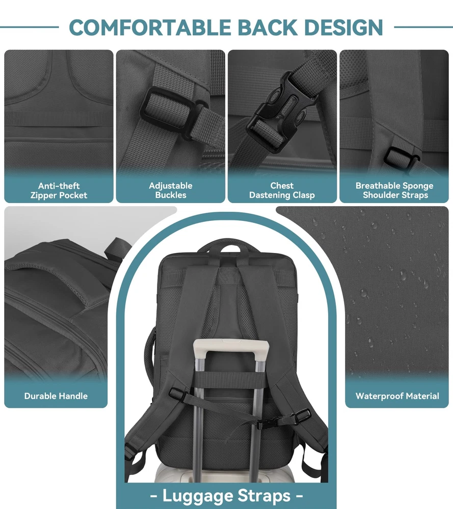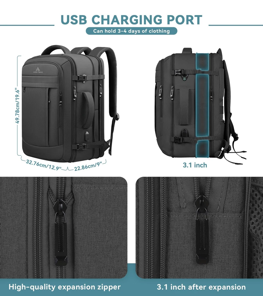 Description large travel backpack for men are durable, protective and specially designed to accommodate and protect laptop computers, office supplies, luggage. The rucksack backpack very suitable for commuting, office work, business trip, traveling, working. Your laptop, MacBook, office documents, ID cards, keys, luggage will be stored and easily accessible šćFriendly Customer ServicećWe provides Lifetime worry-free after-sales service of this travel laptop backpack. If you have any problem about our carry on backpack, please do not hesitate to contact us, we will do our best to resolve it. (THIS ITEM IS NOT INTENDED FOR USE BY PEOPLE 12 AND UNDER.) šćReduce PressurećNormal Size: 19.6 * 12.9 * 5.9 inch; Expanded Size: 19.6 * 12.9 * 9 inch.The travel laptop backpack for men women equipped with adjustable chest straps, air-mesh ventilated back panel, can effectively relieve the pressure on the shoulder and neck.The backpack travel has a thickened sponge handles and shoulder straps provide you with more comfort when you are carrying and gripping the travel laptop backpack. šćExpandable & Large CapacityćThis large travel laptop backpack is designed to be expandable, backpack for travel giving you a large capacity pack up to 50L, unzipping to get larger storage space. The carry on backpack for men women fits overhead and under seat while on state of standard carry on size, ideal for business or weekend travel, and easily carried on most flights. šćAirline Approved & Practialć: The large travel laptop backpack airline approved can be freely unfolded 90-180 degrees, allowing you to quickly pass through airport security and keep things tidy. The luggage strap on back allows the mens carry on backpack for travel to securely slip over the handle of any rolling luggage for hands-free transport, easier carrying. A perfect travel gifts for men women. šćUSB Charging Port & Headphone HolećCarry on backpack built-in USB Charging Port and headphone outside hole design. This travel laptop backpack is convenient to charge your phone(Note: POWER BANK is not included). Headphone jack provide a hole to enjoy the music while walking.