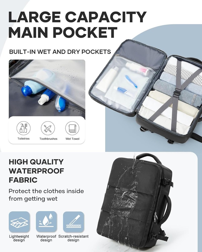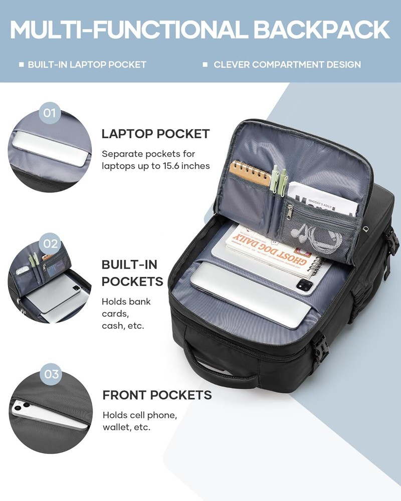 Free eBay listing template designed by dewiso.com Travel Backpack For Women Men Carry On Backpack For Traveling On Airplanes Personal Item Travel Bag laptop backpacks FREE AND FAST SHIPPING! Airline Compliance Size:This carry on backpack measures 10.8*6.3*16.9 inches and weighs 1.54 lbs.This specification meets the size requirements of most airlines for carry-on baggage,which is convenient for you to carry on the plane easily without checking in,and it also provides enough space to meet the storage needs of your belongings for multi-day trips. Fully Functional:This travel backpack combines storage,protection and convenience,with a main pocket that can easily hold multiple changes of clothes,and a special wet/dry separator pocket that effectively segregates wet clothes or toiletries and keeps other items dry. Rational Zoning:This laptop backpack is built-in with multiple independent compartments,specifically with a computer compartment for laptops up to 15.6 inches and below,as well as a tablet compartment,ID pocket,etc.,so that you can categorize your belongings in an orderly manner and access them conveniently. Convenient Details Design:The side of the backpack is equipped with elastic pockets for water bottles or umbrellas,easy to access at any time.Two zippered pockets on the front for storing frequently used small items,such as cell phone,wallet,keys,etc.The top and side handles and the back luggage straps can be carried or used with a trolley case,making traveling easier. High Quality MateriaL:Made of high quality fabric with excellent waterproof and abrasion resistance.Wide shoulder straps and soft padding can effectively reduce the burden on your shoulders.Breathable sponge on the back reduces the feeling of stuffiness on your back and makes you feel comfortable while traveling. Stylish Appearance: Simple and fashionable appearance design, whether as a travel backpack, laptop backpack, work backpack or leisure backpack can be easily managed. A variety of classic colors are available to meet different aesthetic needs, so that you are not only practical in the travel, but also show your personal style. Product We offer a 30-Day Return Policy on items which you are not completely satisfied with. You have the option for a full-refund or an exchange of the item. No returns are available on items shipped outside of the US . Shipping We offer Free Shipping to the US and ship within 2 business days of payment, usually sooner. We use UPS express shipping. That's why your products are usually delivered within 3 days . Contact We try our very best to make sure every customer is completely satisfied. If there's a problem , message us! We're happy to help. 24/7 live chat available.
