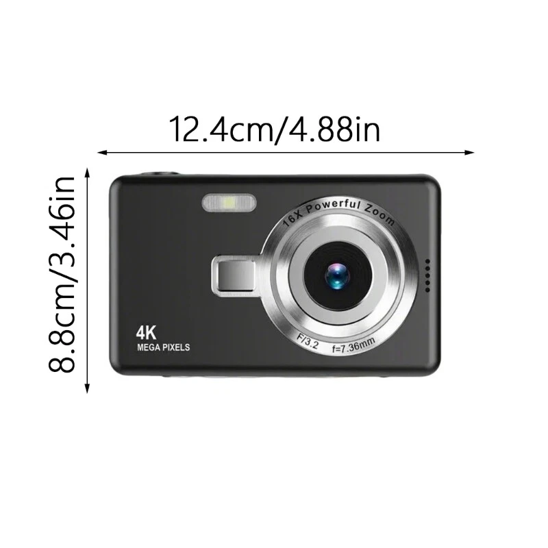 Features: Capturing 96MP and record in HD4K with our advanced digital camera, 1080P screen and autofocused for seamlessly vlogging and photography experiences. Equipped with 16x digital camera shake proof technology, this camera ensures stable photography even in challenging lighting conditions, for both indoor and outdoor use. This multifunctional camera offers creative possibilities, ensuring never missed a moment worth sharing. Fashionable appearance, with advanced technology, for clear and more stabled video. Suitable for people who like travelling, photography enthusiasts and those who need to record beautiful moment in daily Specifications: Effective pixels: 96MP Digital: 16x Resolution:about 1080P LCD screen size: 2.4inches Charging port: USB 5V 3.7V Color: Optional Size:about 12.4x8.8x6.3CM/4.88x3.46x2.48in Component:ABS Time of Continuous use:for 3-6Hrs Package Includes: 1Set Digital Camera note: Due to the problemsof lighting effect, there mightbe certain tolerances in product, please understand. Please allow 0-1cm error due to the measurement.