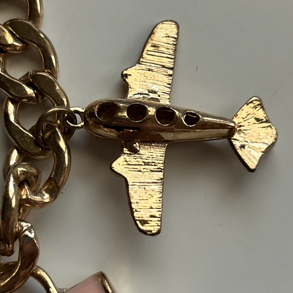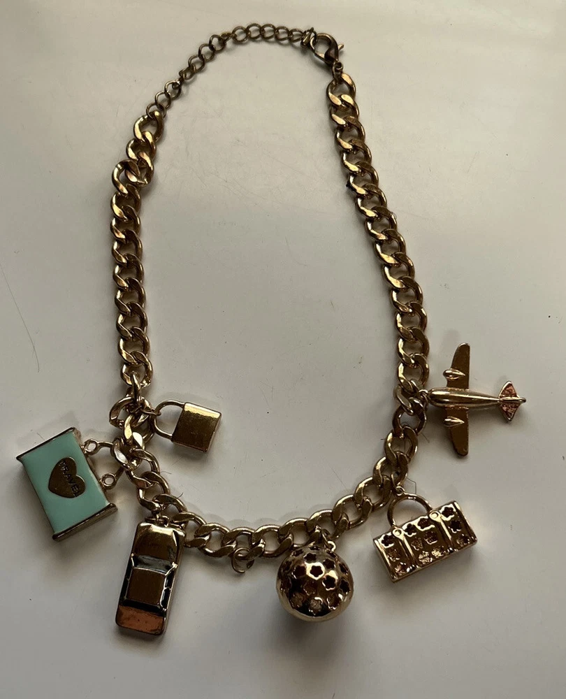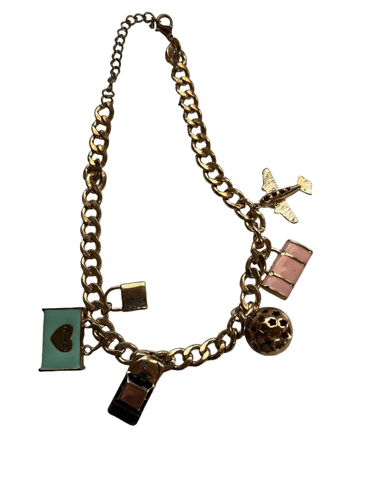 This stunning gold curb chain necklace is the perfect accessory for any travel enthusiast. The necklace features a variety of travel-themed charms including a car, suitcase, and airplane, all hanging from the chain in a stylish and unique way. The 18" length makes it a perfect fit for anyone, and the no-stone design ensures that this necklace can be worn on any occasion. Whether you're jetting off to a new destination or just looking to add a touch of adventure to your outfit, this necklace is sure to impress.