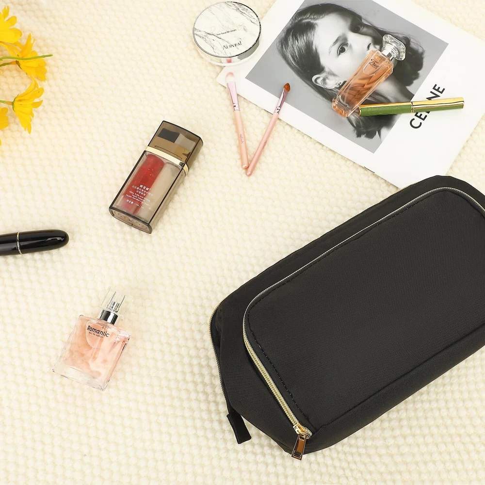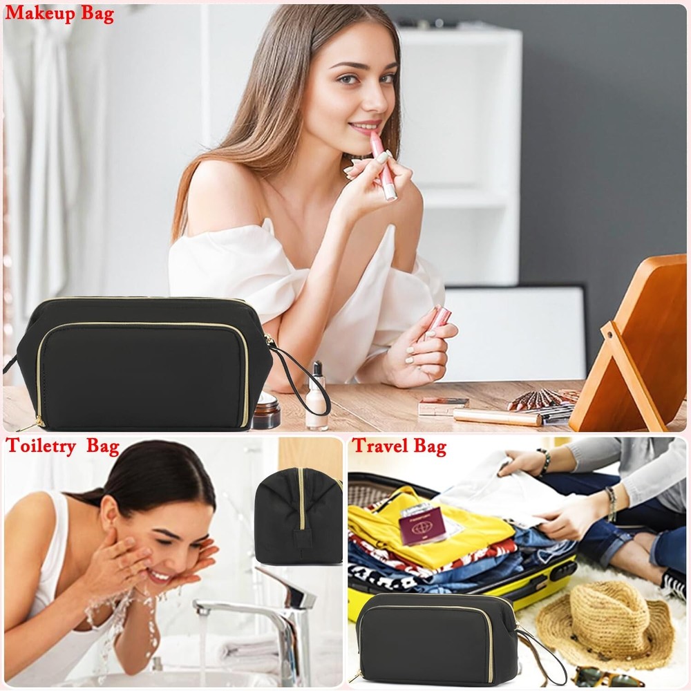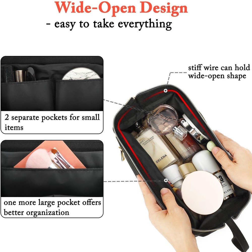 Travel Makeup Bag, Wide-open Cosmetic Bag Make Up Organizer Case with Brushes Pocket for Women, Large Family Toiletry Bag Skincare Pouch for Toiletries Accessories Product Details Color: Black Brand: Fammart MPN: NJLO01-BK24 UPC: Does not apply EAN: Does not apply Product Dimensions: 9.84 x 4.72 x 6.69 inches Item Weight: 7.4 ounces Department: Unisex Adult Manufacturer: Jingweichuangke Country of Origin: China Item model number: NJLO01-BK24 Wide-Open & Hands-Free DesignThis makeup travel bag stands upright on its own, featuring a large wide opening that provides a full view of all your items, making it easy to find what you need without the hassle of digging through like traditional cosmetic bags. Exclusive Brush PocketThe front zippered pocket is lined with stain-resistant aluminum foil and includes six elastic loops to keep your makeup brushes clean and organized. A large PVC interior pocket is perfect for storing powder puffs or sponges. Spacious & PortableMeasuring L:9.84" * W:5.91" * H:6.69", this skincare bag offers a multi-compartment design to neatly store cosmetics and small items. The long handle make it easy to carry, whether at home or on the go. High-Quality MaterialsMade from tear-resistant, water-resistant polyester, this makeup bag is soft yet durable. The padded lining offers extra protection for your cosmetics, while the gold zippers add a touch of elegance. Perfect Gift IdeaPerfect for cosmetics, toiletries, or as a general travel accessory, this make up bag combines style and functionality. It also makes a thoughtful gift for mom, teacher, friend, family, bridesmaid, girlfriend, sister and co-worker for various occasions like birthdays, Christmas, Thanksgiving, Valentines Day.