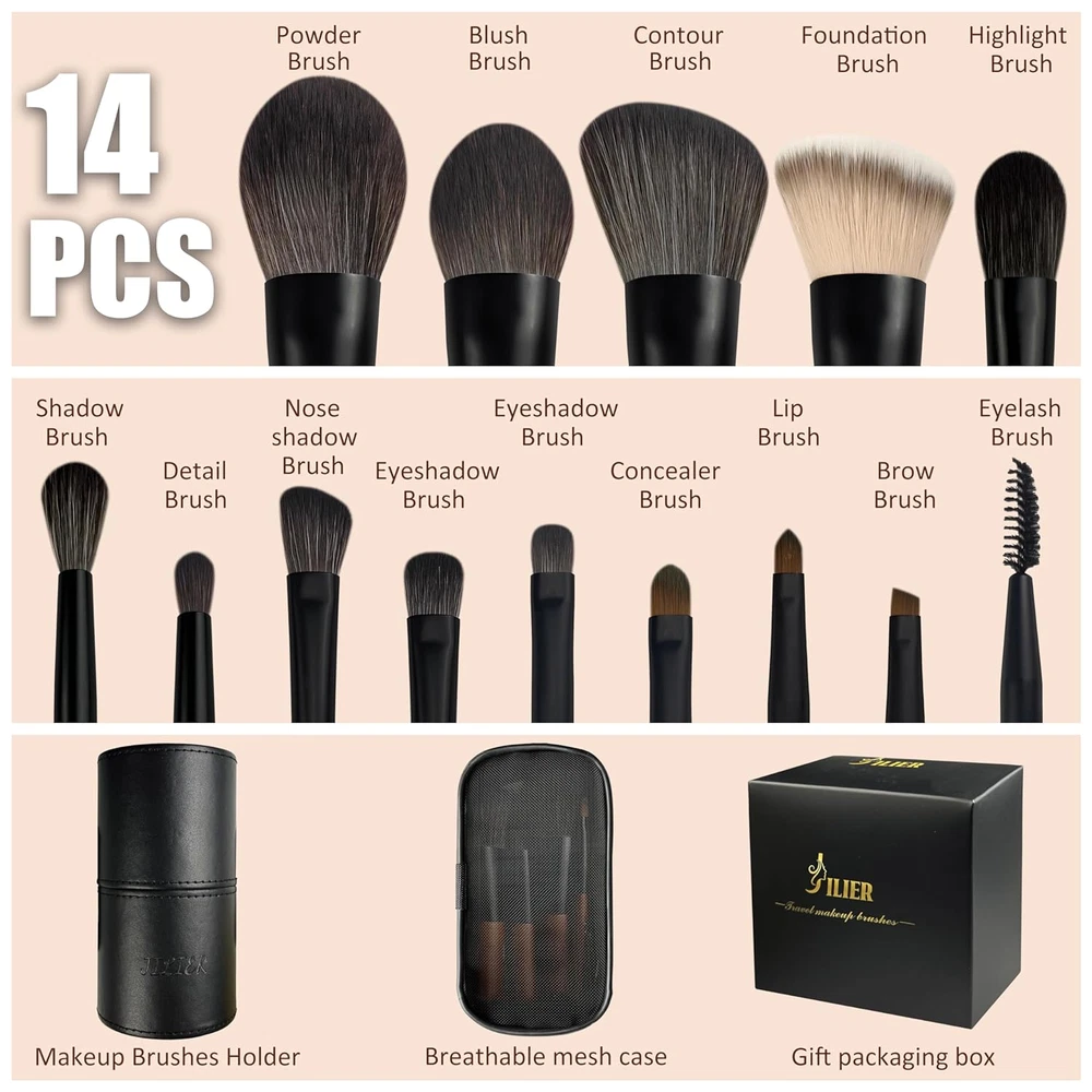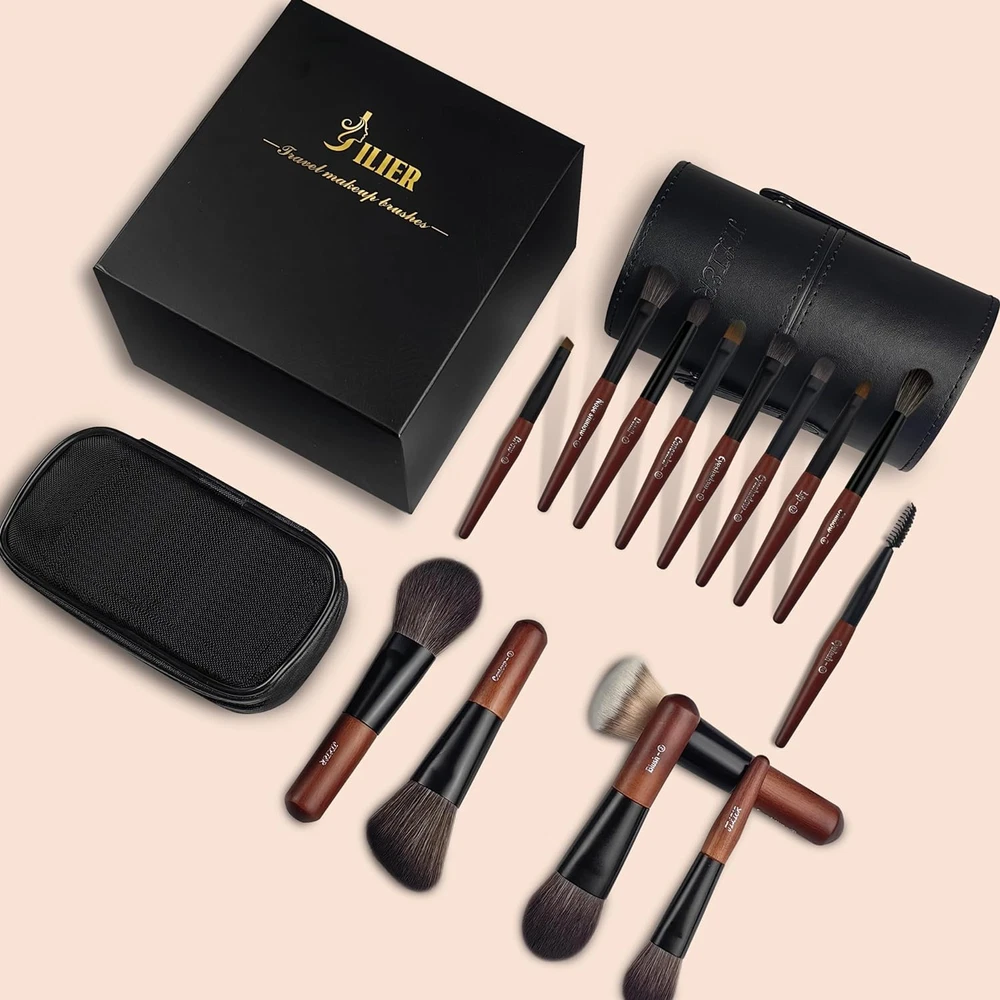 【Travel Size Makeup Brushes】: Jilier mini make up brush sets with case, easy to carry, suitable for travel or outdoor use, as well as daily makeup. 【Makeup Brushes Set Professional】: This brush set has every brush you need for a full face makeup application, The handle of each brush is engraved with the number and brush name, which is clear at a glance and convenient for you to use. 【 High-Quality Face Makeup Brushes】: Handles of the travel brush set are made of high-end alloy and 100% natural wood. The bristles are made with fine synthetic fibers, reduce shedding and ensure maximal brush life. 【Perfect Gift Idea】: Wonderful brushes set in a gift-box packaging is a decent gift for beauties on any occasion, such as birthday, Valentine's Day, any Anniversary, Mother's Day, Christmas Day, New Year, Thanksgiving Day, etc 【100% Guarantee】Jilier is committed to providing the finest and most desirable cosmetic products for every makeup lover. if you are not satisfied, please contact us. Product Description Perfect Travel Brushes——Jilier Mini Makeup Brushes Set Professional Makeup Brushes Set Each brush has an engraved number and brush name, easy to see and use at a glance. 100% Natural Wood Handle Durable and feels good in hand Thickened Aluminum Ferrule Stylish & durable Comfortable and Soft Bristle Skin-friendly and non-irritating Unique Liquid Foundation Brush Soft dense bristles, do not absorb or waste products Travel Size Makeup Brushes Set with Case, Easy to carry, allowing you to stay beautiful anytime and anywhere.