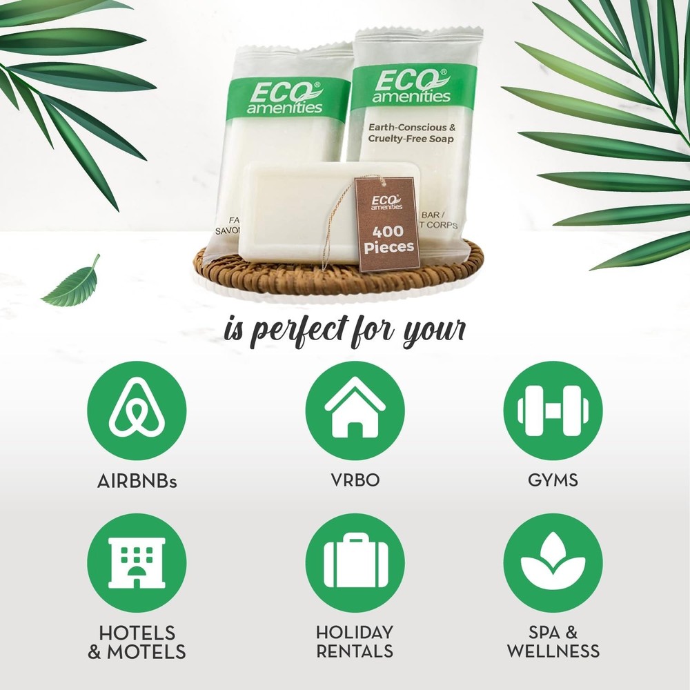 Travel Size Bar Soap - 400 PACK, oz Mini Soap Bars, Hotel Soap Bars, Travel Size Toiletries - Individually Wrapped Bulk Soap Bar, Small Hotel Soaps for BNBs, VRBO, Inns and Hotels FLEXIBLE USE - bulk hotel soap set is perfect for all your needs: hotels and motels, airbnbs, VRBOs, vacation rentals, bed & breakfasts, resorts, airlines, offices, gyms, guest rooms, & other hospitality locations. SUSTAINABLE, CRUELTY-FREE - Does not contain paraben, harsh chemicals, heavy perfumes or irritable additives to the skin. Never tested on animals, our soaps are packaged in biodegradable wraps that won’t fill landfills or harm wildlife. TRAVEL SIZED - Small toiletries perfect for your travel needs. Each soap is (14 grams) – good to bring on the go for any trips and vacations! TSA Approved, individual packaging makes the product easy to transport, share, and use. 400 PIECE VALUE PACK - Get value for your money with our large bulk pack of individually wrapped guest soaps, made by the direct supplier of star hotel groups. Our portable travel soap bars are fit for your trips or to provide to guests. NATURAL, FRESH SCENT - Light unisex green tea scent to delight your senses. Made of all-natural ingredients, our soap is specially formulated to revitalize, refresh, and renew, while being good for both your skin and the environment.