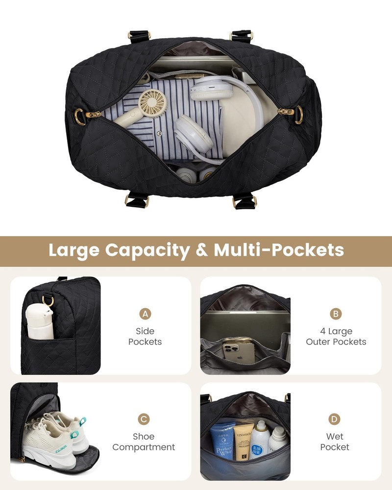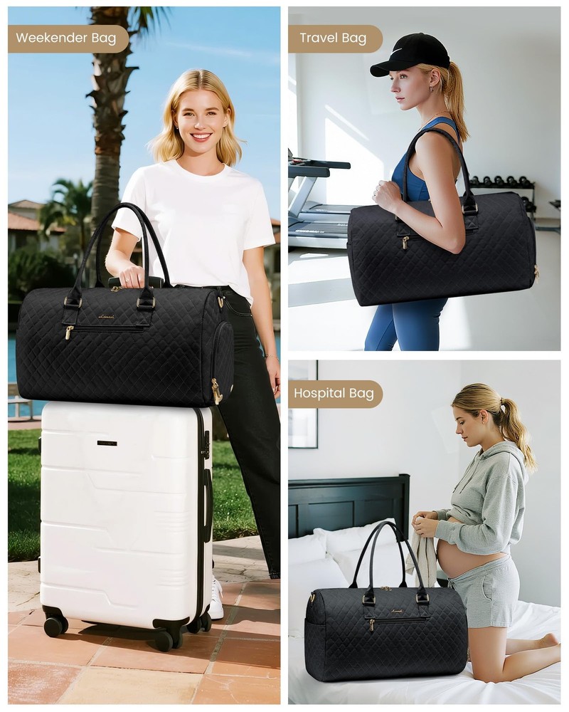 Travel Duffle Bag, Weekender Bag for Women with Toiletry Bag, Carry on Overnight Bag with Shoe Compartment, Gym Duffel Bag with Wet Pocket, Mommy Hospital Bags for Labor and Delivery 【TRAVEL TOTE BAG WITH SHOE COMPARTMENT+FREE SEPERATE TOILETRY BAG】: 1. comes with a $15 toiletry bag 2. comes with adjustable & detachable sling strap and handles.This is 's latest upgrade combination travel duffel bag set: adds seperate shoe compartment & toiletry bag, the shoe compartment of this travel bags for womencan hold your shoes or dirty clothes for easy separation from clean clothes when traveling. 【CARRY ON BAGS FOR AIRPLANES】:Sizes- 21 x 8 x 13 inch,2.6Lbs, duffle bag for women meets most international carry-on requirements.Fits in the overhead compartment as well as the under seat as Personal Items in flight.Integrated trolley sleeve slides over rolling luggage handle making airport travel a breeze.One zippered pocket on the back to hold your smart phone, IDs or passport.Your ideal overnight weekend boarding bag for business or personal travel. 【STYLISH WEEKEND BAG & OVERNIGHT BAG FOR WOMEN】:With a total of 7 pockets and 1 compartments,Roomy space can even fit in 3-5 days of daily essentials,Easily fit into your clothes,toiletries,shoes,laptop,Ipad and other items.In the front of the duffle bag for travel, there is a pocket for easy access electronics or travel materials.Featuring with classy and gorgeous appearance, Our travel duffel bags reach morden urban ladies greatest demand and fantasy on travel bag. 【DRY WET SEPARATED GYM BAG & HOSPITAL BAG】:The high density water resistant material can help you to separate dry items and wet items,if you have wet clothes or towel,you can put it in this gym bag for women.Our womens gym bag is a perfect reliable companion for both indoor and outdoor sports.It is perfect for workout,travel,tennis,basketball,yoga,swimming,camping and many outdoor activities. It can also be used as a medical bag,hospital bag and mommy bag. 【MULTIPURPOSE DUFFEL BAG & PERFECT SERVICE】:Use it as a duffel bags for traveling,personal item travel bag,mommy bag for hospital,weekend bag for women, gym bags for women, carry on bag, or laptop bag.,it can also be used as a Christmas gift,suitable for family, friends, and partners.With 's reliable after-sales service and fine craftsmanship, We promise that if you are not satisfied within one month, you can unconditionally. Why Choose traveling bag? carry on duffel bag can be carried in a variety of different ways. It can be used as a business trip bag with its handles or as a Travel weekend bag for short trips. Whether you are a college, fitness enthusiast or professional business woman, don't forget to exercise and eat healthy to keep fit. Specifications: Size: 21 x 8 x 13inch Weight: 2.6 lbs; High-Quality Material: Quilted Nylon Fabric (Waterproof & Light-Weight ) Best Uses: Gift, yoga, work, business trips, traveling, sport, beach, camping. Features: ● Laptop pocket- for up to 15.6" laptop ● Large main compartment- storage clothes, shoes and other work or travel accessories ● Dry Wet Separated Pocket- Separate dry and wet items, can put toiletries, towels ● Independent Shoe Compartment- Perfectly separate your dirty shoes or clean clothes ● Front/Back easy access zipper pocket- small accessorie,passport,cell phone ● Side pockets- can hold your large water bottle or umbrella Shipping We offer FREE shipping on all orders! We ship within Three business days of payment, usually sooner. We use a selection of shipping services such as UPS, FedEx, USPS etc. We only ship to the lower 48 states, no APO/FPO addresses or PO Boxes allowed. Local pickups and combined shipping options are not provided at this time. Return You can return a product for up to 30 days from the date you purchased it. Any product you return must be in the same condition you received it and in the original packaging. Please keep the receipt. Payment We accept payment by any of the following methods: PayPal Please pay as soon as possible after winning an auction, as that will allow us to post your item to you sooner! Feedback Customer satisfaction is very important to us. If you have any problem with your order, please contact us and we will do our best to make you satisfied. Contact Us If you have any queries, please contact us via ebay. We usually respond within 24 hours on weekdays. Please visit our eBay store to check out other items for sale! Thank you for shopping at our store.