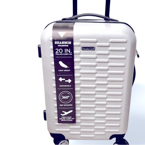 1-Piece Shannon Expandable Luggage Exterior Dimensions (20"): 22" x 15" x 9.8" Push-button telescopic handle system Dual 8-wheel spinner system for 360 degree effortless movement Push-button telescopic handle system Dual 8-wheel spinner system for 360 degree effortless movement Fully-lined interior with adjustable compression straps to hold contents in place Top and side handles 4 leg 'studs' on side of luggage to safely lay luggage on the ground Outer Material: ABS Hardshell. Inner Material: Polyester Wipe clean