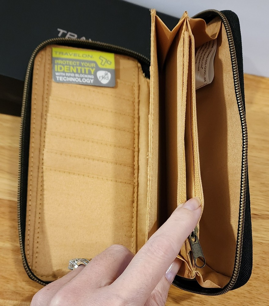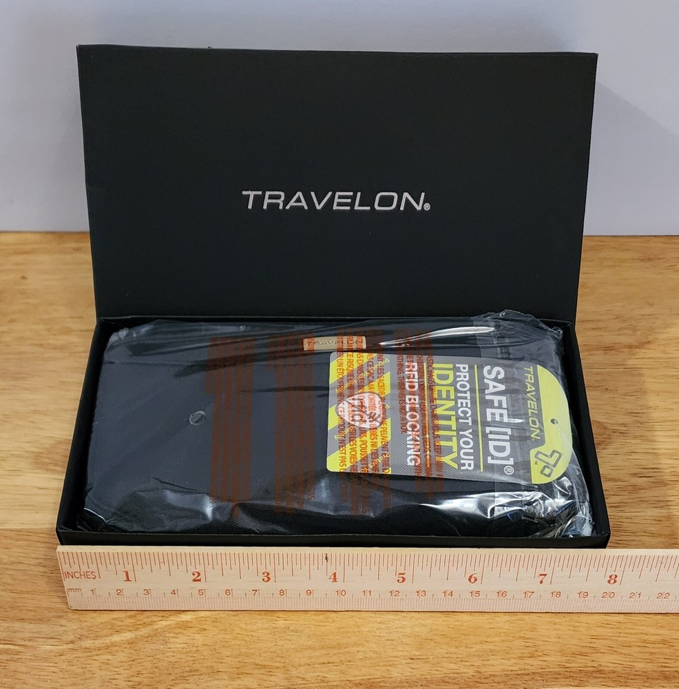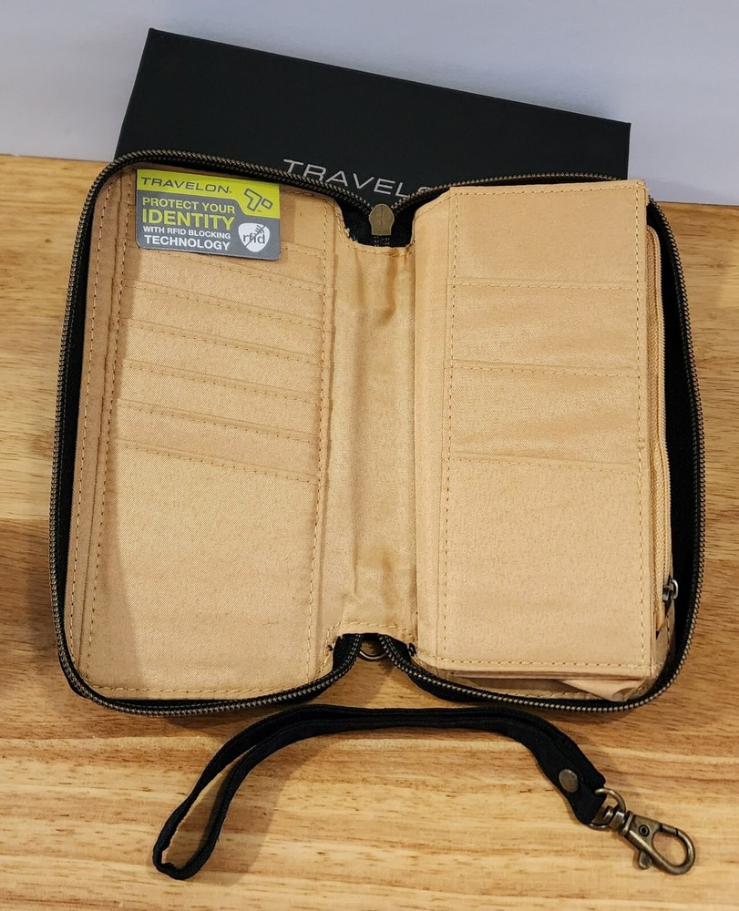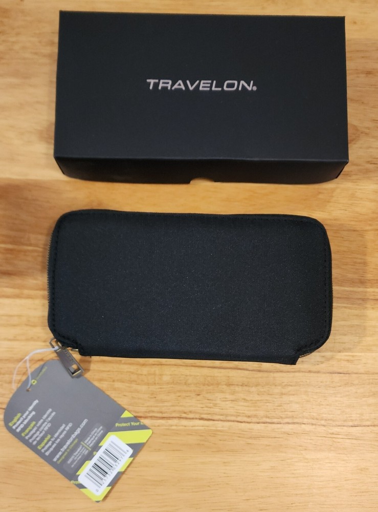 Travelon Wallet BLACK Safe ID RFID Blocking Zip Around Close Wristlet Strap Measures 7.5" x 4" Will combine shipping for multiple purchases. Add all items to cart and request invoice, or you may purchase each item w/shipping and I will provide a refund for shipping if it exceeds the final shipping cost. Shipped on same or next business day. Returns accepted within 30 days. Buyer responsible for return shipping. Item must be returned in same condition with tag still attached.