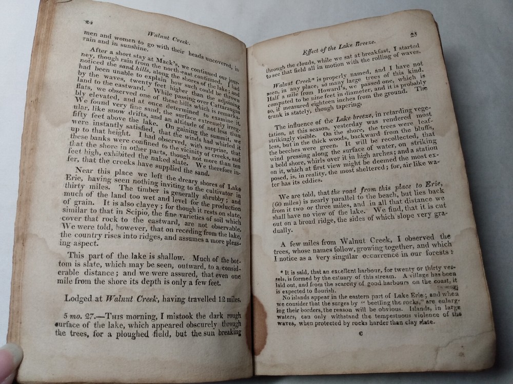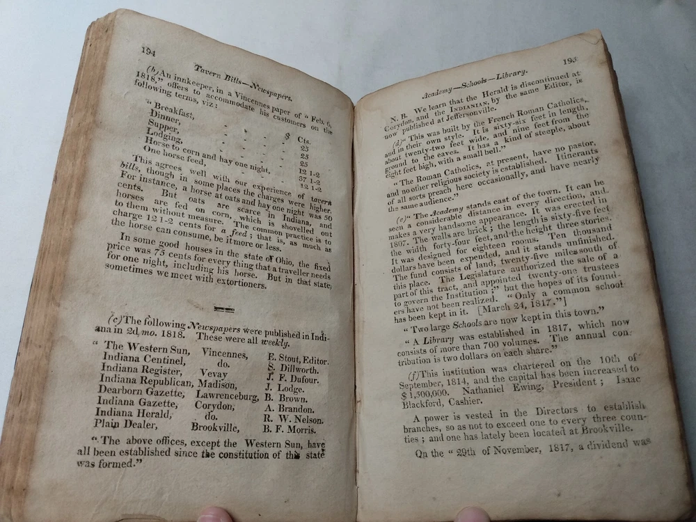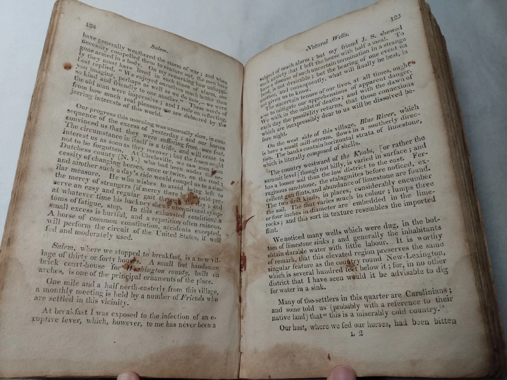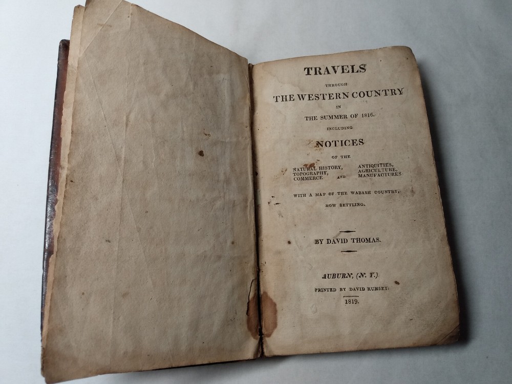 Important & historic classic! Travels Through The Western Country, in the summer of 1816. Full leather hard cover by David Thomas, includes natural history, topography, commerce, agriculture and more! Dated 1819, with 320 pages. Over 200 years old! Heavy wear, typical for the age. Blemishes and staining to pages, page tanning and wrinkling throughout, heavier wear to covers. Missing the map.