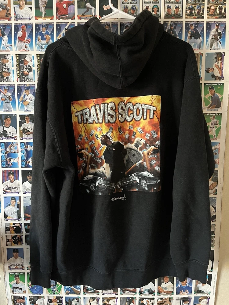 Introducing the Travis Scott x Diamond Supply Co. Merch Hoodie in black, perfect for any hip hop fan. This hoodie features a solid pattern with a logo accent and a drawstring closure. It is made of a cotton blend fleece material, making it heavyweight and suitable for all seasons. The long sleeve hoodie is machine washable and comes in a regular fit, suitable for men who wear a size large. It is a designer piece, part of the Travis Scott product line, perfect for those who love hypebeast and hip hop themes. The collarless hoodie is a great addition to any activewear collection.