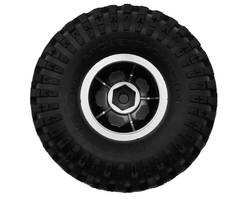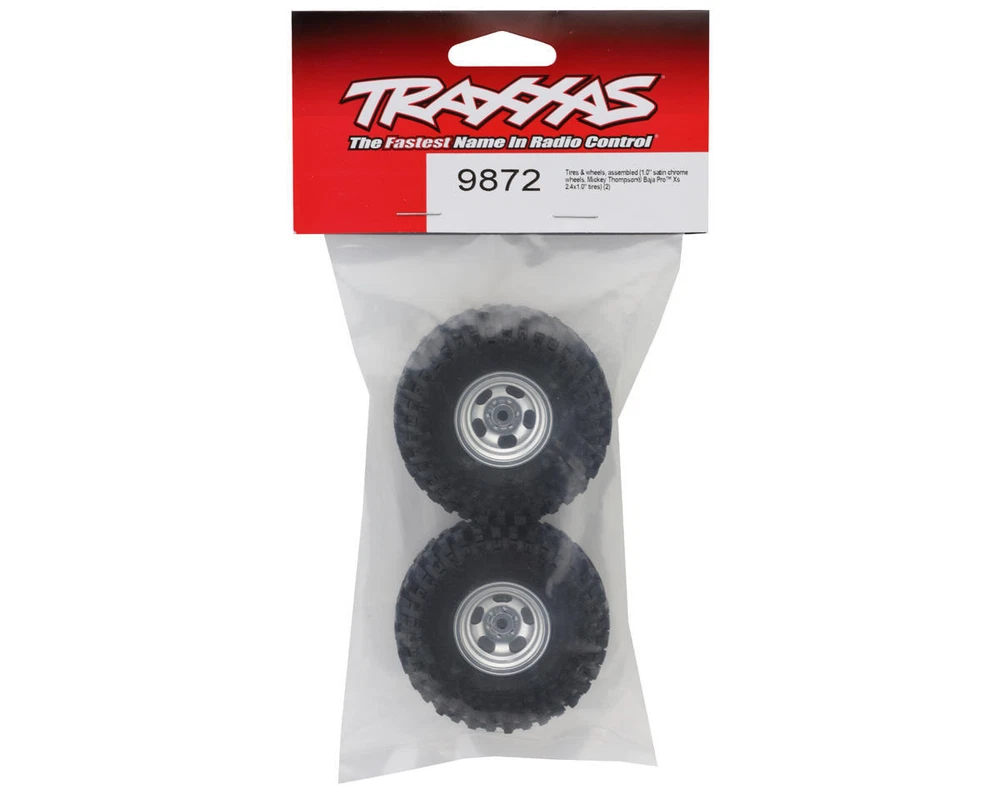 Pre-mounted Tires Overview: Traxxas® 1.0" Mickey Thompson Baja Pro XS Micro Pre-mounted Tires. Officially licensed by Mickey Thompson to Traxxas, these 1.0" Mickey Thompson Baja Pro XS micro tires replicate the real 1:1 tires in scale and performance with scale realistic aggressive tread and sidewall design! Ideal for a range of off-road conditions, the Mickey Thompson Baja Pro XS provides maximum traction on loose, muddy, rocky or uneven terrain while adding a rugged scale look to your rig! In addition, this comes pre-mounted on a scale realistic classic satin chrome 5-slot wheels! Features: Officially licensed by Mickey Thompson to Traxxas Pre-mounted on classic satin chrome 5-slot wheels Replicates the real 1:1 tires in scale and performance Aggressive lugs tread design Provide maximum traction on loose, muddy, rocky and uneven terrain Ideal for a range of off-road conditions Balances durability with grip for long-lasting performance Specifications: Application: 1/24 & 1/18 scale Micro Rock Crawlers Outer Diameter: 2.4in (61mm) Inner/Bead Diameter: 1.0in Hex Size: 7mm Includes: (2) Mickey Thompson Baja Pro XS Micro Pre-mounted Tires w/Satin Chrome 5-Slot Wheels About Us | View Store
