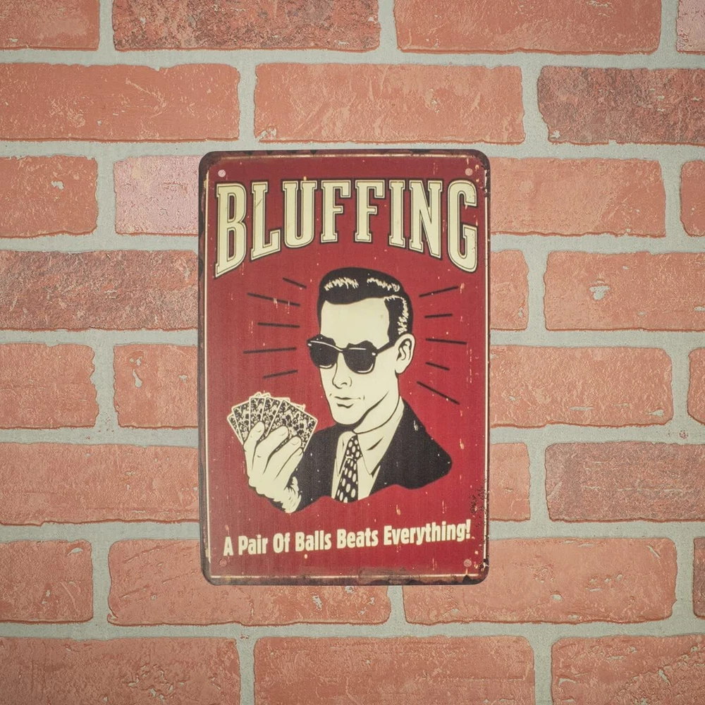 Show everyone you have the testicular fortitude needed in a poker game with this novelty wall sign. Made from metal and made to look retro, this funny wall decor reads: "BLUFFING A Pair Of Balls Beats Everything!" on a deep red background with distressed edges and the graphic of a man in a tie and sunglasses holding a poker hand, reminiscent of 1950s advertisements. Great humorous decor for your man cave, rec room, or poker night, this novelty sign is shows it takes a pair of balls to bluff. Mount this metal sign on your bar or pub wall and get laughs from customers and guests. Give this novelty metal sign as a gift to friends or family members and get one for yourself. Novelty poker game sign makes you interesting wall art measures approximately 12" long, 8" wide, and includes 4 pre-drilled holes for easy wall or door mounting. As with all our items, this funny metal sign ships brand new with our 100% customer satisfaction guarantee. Show everyone you have balls with this novelty wall sign Funny wall decor reads: "BLUFFING A Pair Of Balls Beats Everything!" on a red background Metal bluffing sign is great wall decor for your garage, man cave, bar, or next poker game Give this metal sign as a gift to friends or family members and get one for yourself Novelty wall art measures approximately 12" long, 8" wide, and includes 4 pre-drilled holes