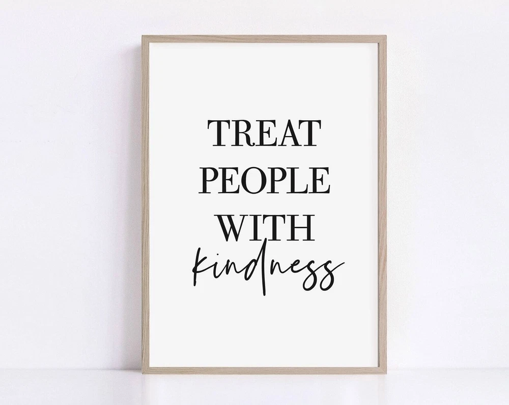 Treat People With Kindness Quotes Poster Printable Wall Art Motivational Wall Decor Print Positive Vibes Art Material: Premium luster photo paper Print type: Inkjet printing One side printed + The finish provides the highest possible resolution and color saturation + Lasts up to 200 years in color and 400 years in black-and-white + Printed on high-quality resin-coated photo base paper medium + Posters can be hung with double-sided tape, tacks, or framed + Hand washing with a gentle cry cloth is recommended for extended durability I will hand select the best choice of paper for your chosen design to ensure top quality results for a beautiful, bright and luxurious print. All prints are sealed in cellophane slips for protection during transportation, and are shipped in a protective cardboard envelope.