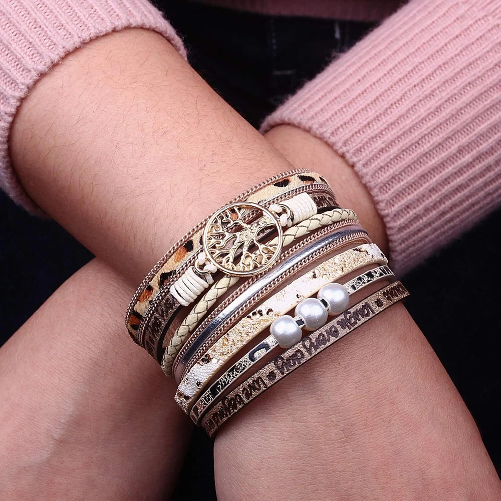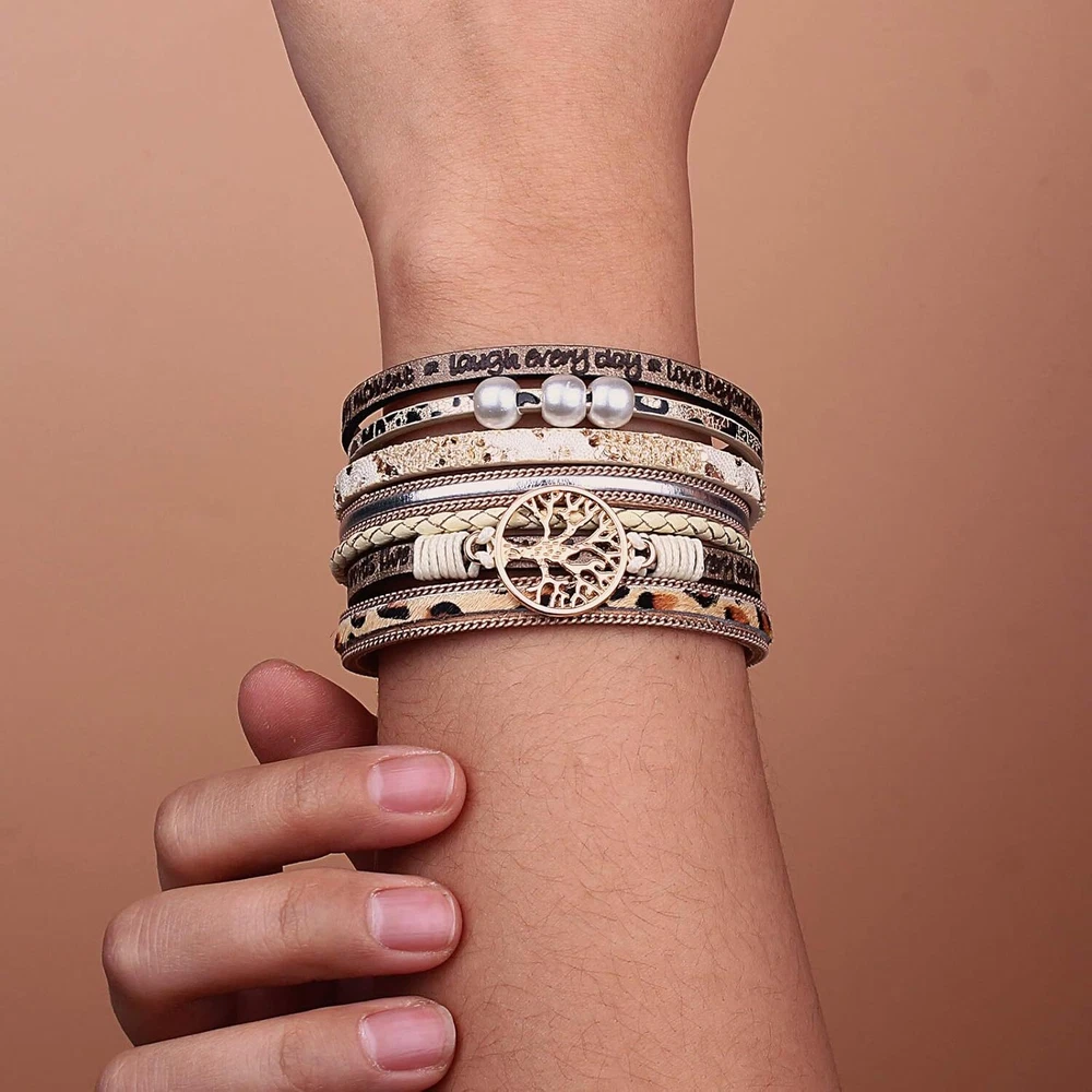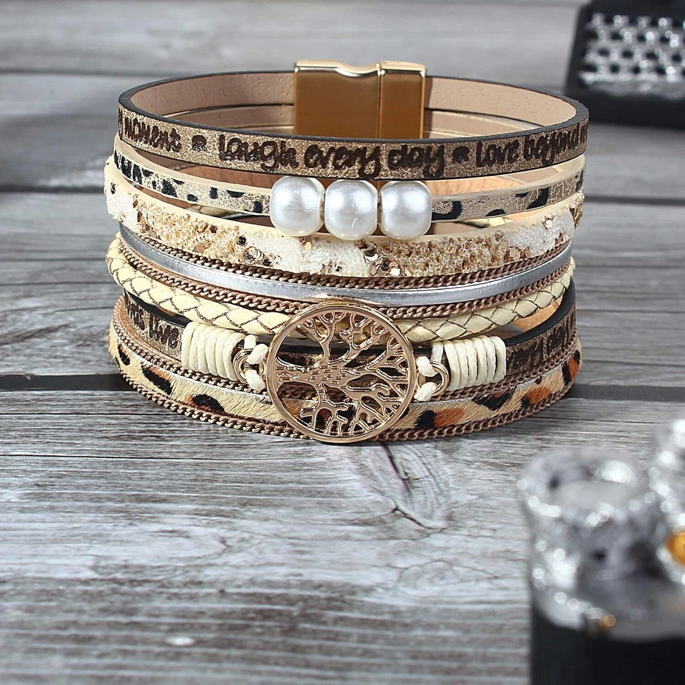 Store New Arrivals Add to Favorite View Feedback Contact Tree of Life Leather Wrap Bracelet Inspirational Cuff Bangles Boho Pearl Description Chain Strand Gem Type no gemstone Color Beige Cheetah Material Leather Metal alloy Model number TOL-BgLpd Item Length 0.01 inches Department womens Clasp Buckle Engraved Bracelet: “Live Every Moment,Laugh Every Day,Love Beyond Words”. The wide cuff bracelet is decorated with 3 cute pearls and a dainty family tree. Secure and Strong Clasp: It is easy to put on and take off the bohemian bracelet with the high quality clasp. Quality Control: The cool multi-strand bracelet is made of top grade leather, comfortable to wear, no fading, no pungent smell, stackable with other bracelets. Size: Length: 7.5 Inch, Width: 1.4 Inch. Fits for most wrists. Age: Over 12 years old. Product Description Magnetic Clasp It is easy to clasp on your own with a secure and strong clasp. Tree of Life Charms The tree of life is a symbol of a fresh start on life, positive energy, good health and a bright future. ABOUT US We offer the best prices around on high quality products. Our E-store includes media such as books, movies, music and games while offering electronics, toys, sporting apparel, clothing, tools, general home, garden items and more. SHIPPING We are always working hard to ensure your package arrives as soon as possible. Please understand that some factors like weather, high postal traffic, and the performance of shipping companies are outside of our control. We offer free shipping to the lower 48 states and ship within 2 business days of payment, usually sooner. We do not accept P.O. Boxes. Please provide a physical address. RETURNS We offer a 30-Day Return Policy on items which you are not completely satisfied with. You have the option for a full-refund or an exchange of the item. No returns are available on items shipped outside of the USA. PAYMENT We accept PayPal. CONTACT US This page content is yet to come Please ad us to your favorite seller and visit again later Thank You CUSTOMER SATISFACTION We try our very best to make sure every customer is completely satisfied. If there's a problem, message us! We're happy to help.