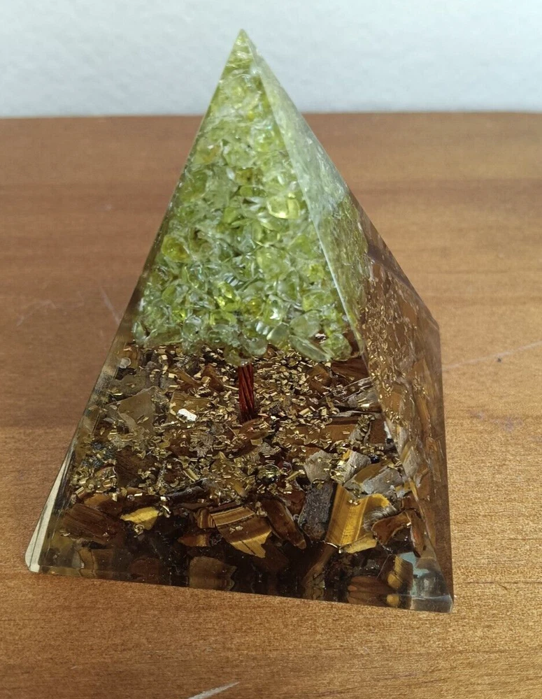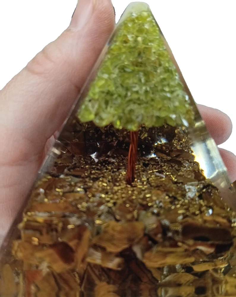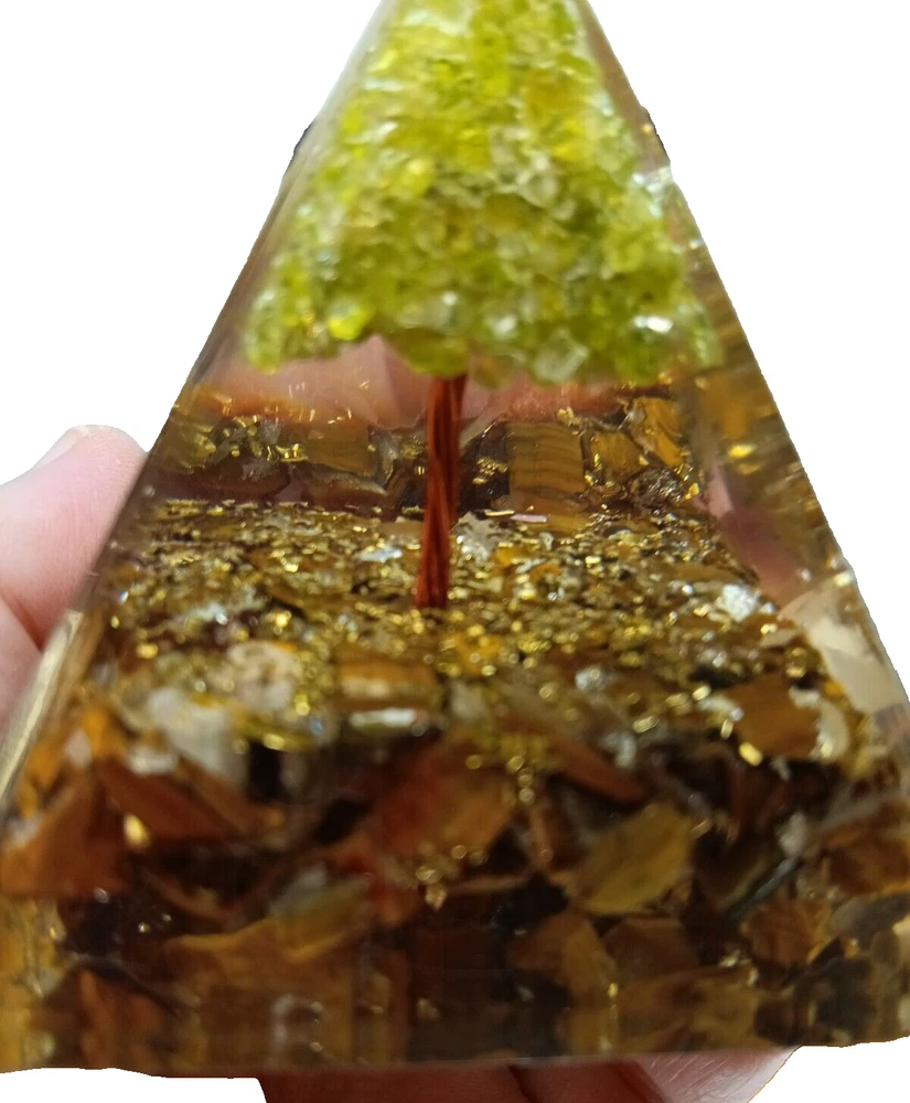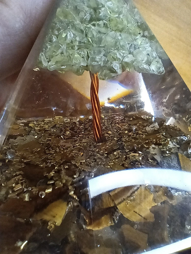 This beautiful resin paperweight figurine measures 3" in height, 2.5" in width at the base. It has tiger eye and Peridot with copper wire creating the tree trunk. Please see all photographs as they are part of the description. Shipped with USPS Ground Mail. F41