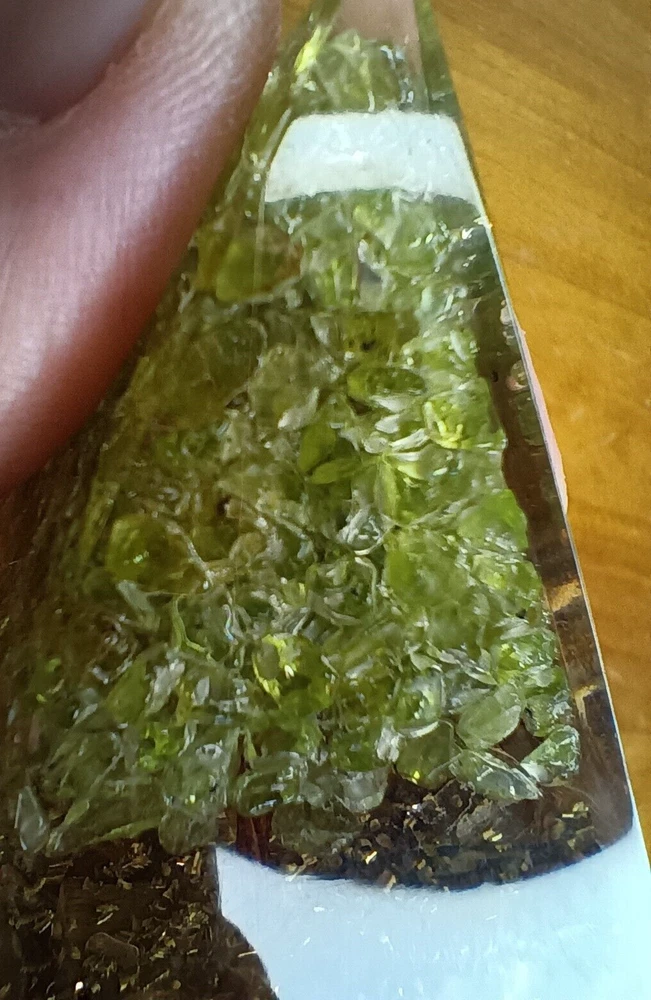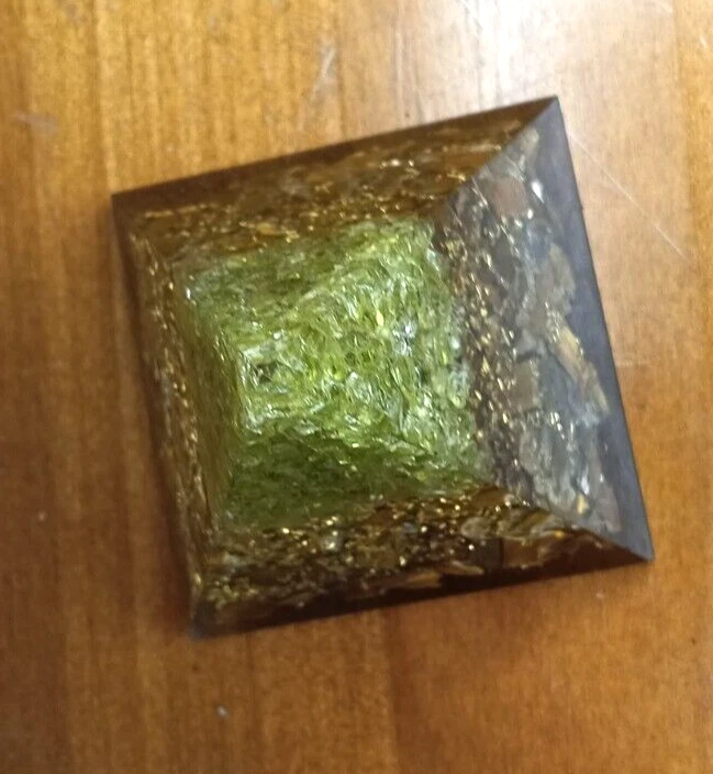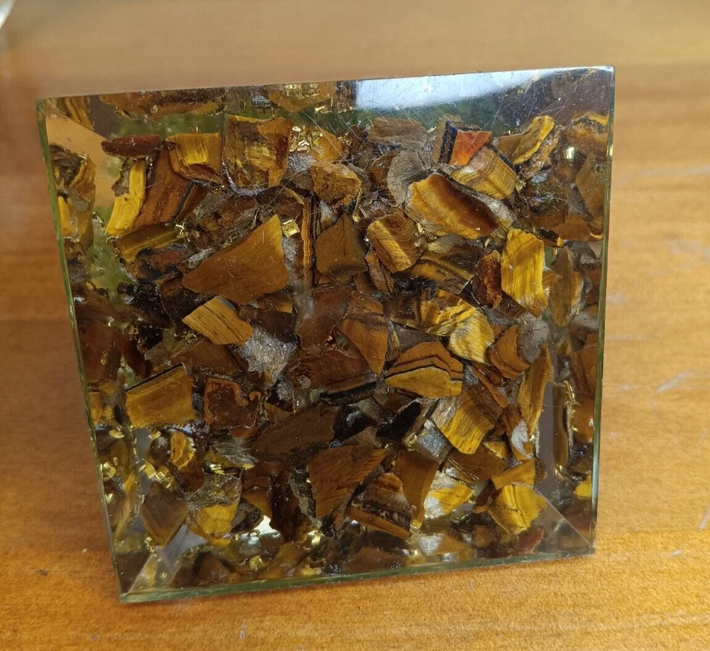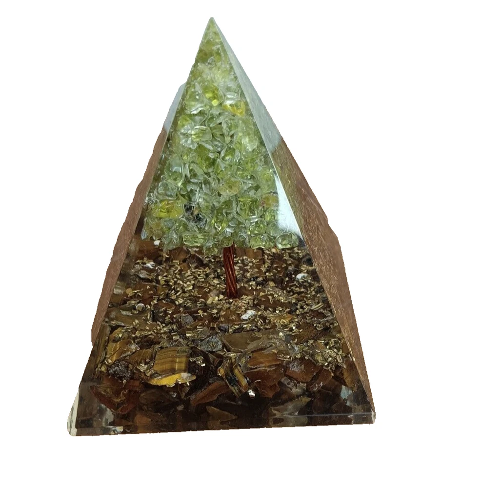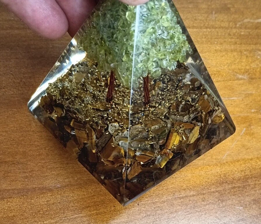 This beautiful resin paperweight figurine measures 3" in height, 2.5" in width at the base. It has tiger eye and Peridot with copper wire creating the tree trunk. Please see all photographs as they are part of the description. Shipped with USPS Ground Mail. F41