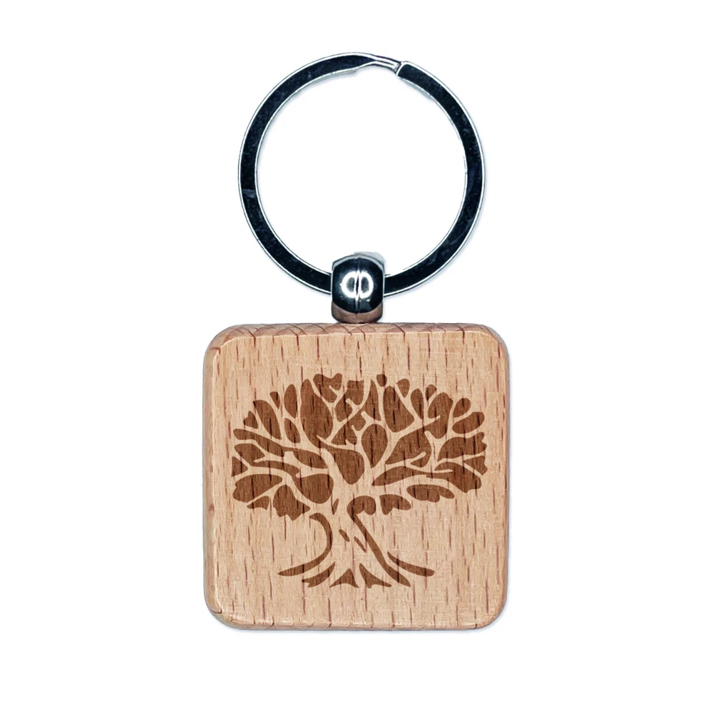 Tree with Exposed Branches and Leaves Engraved Wood Square Keychain Tag Charm