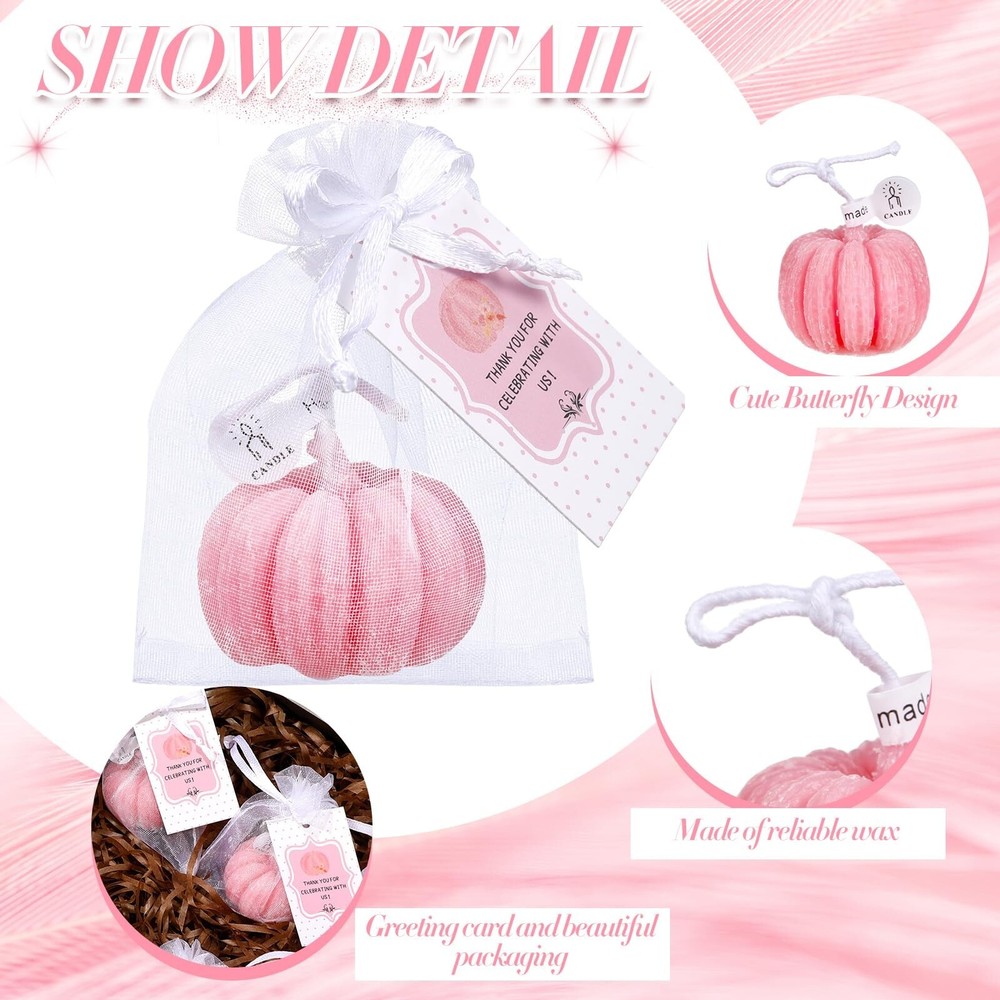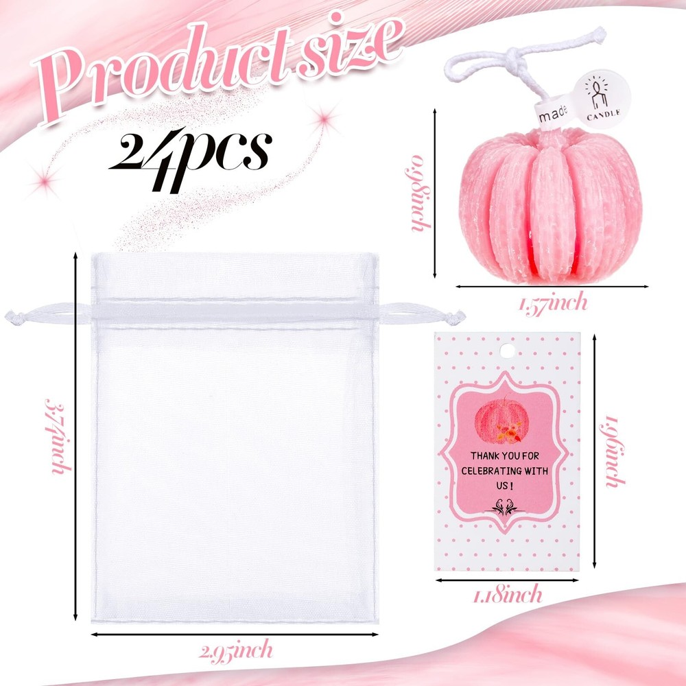 Treela 24 Sets Pumpkin Candles Fall Baby Shower Party Favors for Guests Little Pumpkin Shape Tealight Candle for Thanksgiving Autumn Baby Shower Wedding Birthday Thank You Return Gifts(Pink) Product Details Color: Pink Brand: Treela MPN: Treela-Baby Shower-56 UPC: Does not apply EAN: Does not apply Brand: Treela Color: Pink Product Dimensions: 1.57"W x 1.57"H Item Weight: 0.62 Kilograms Number of Items: 24 Are Batteries Included: No Indoor/Outdoor Usage: Indoor Specific Uses For Product: Decoration Shape: Pumpkin Material: wax, organza and paper Brand: Treela Color: Pink Product Dimensions: 1.57"W x 1.57"H Item Weight: 0.62 Kilograms Number of Items: 24 Are Batteries Included: No Indoor/Outdoor Usage: Indoor Specific Uses For Product: Decoration Shape: Pumpkin Material: wax, organza and paper Container Material: Organza Occasion: Baby Shower Seasons: All Season Special Feature: Clean Burn Style: Pink Pumpkin Wick Quantity: 1 Theme: Baby Shower, Pink Pumpkin Pattern: 3D Package Information: Bag Unit Count: 1.0 Count Embellishment: Bow Material Feature: lightweight, writable Candle Type: Tea Light Candle Size: Pumpkin Manufacturer: Treela Item Weight: 1.37 pounds Country of Origin: China Item model number: Treela-Baby Shower-56 Warranty Description: Na. Batteries required: No Practical and Full Package: the package contains 24 shower party favors kits for guests to use; Each set contains 1 pink pumpkin candle wrapped in 1 white organza bag and decorated with 1 thank you tag for practical application, also enough to share Cute Pink Pumpkin Design: the little pumpkin tea light candle features the 3D pink pumpkin pattern that looks cute and lovely, making it an ideal welcome gift for showers, also suitable for gender reveal parties Welcome to the World: the shower candle favors with thank tags and white mesh bags offer an unusual and fun opportunity to welcome a newborn into the world with the sincere wishes and deep love by lighting candles, which not only shows your appreciation for their presence, but also allows them to participate in warm and lovely celebrations, making the day meaningful and joyful Long Burning Time: the tealight candles are made of quality wax and can burn cleanly for about 2 to 5 hours without wind, creating a romantic and warm atmosphere for your party, light weight and easy to carry, ideal choices for your party Widely Applicable: using exquisite and lovely design, the shower tea lights candles for guests gifts are widely applicable to many kinds of themed showers, touching everyone's heart and winning their praises Features: Easy to match: Considering the simple and stylish designs, bright and vibrant colors, the shower thank you gifts for guests are easy for you to match well with various styles of occasions. Creative and intimate designs: The cute shaped tealight candles are classic and stylish. They are suitable for you to decorate, which can add beautiful embellishments for your home. Specifications: Material: wax, organza and paper Main color: as pictures shown Size: White organza bags: approx. 2.76 x 3.54 inches Thank you tags: approx. 1.18 x 1.97 inches Package includes: 24 x Cute shaped candles 24 x White organza bags 24 x Thank you tags Notes: Manual measurement, please allow slight errors on size. The color may exist a slight difference due to different screen displays.