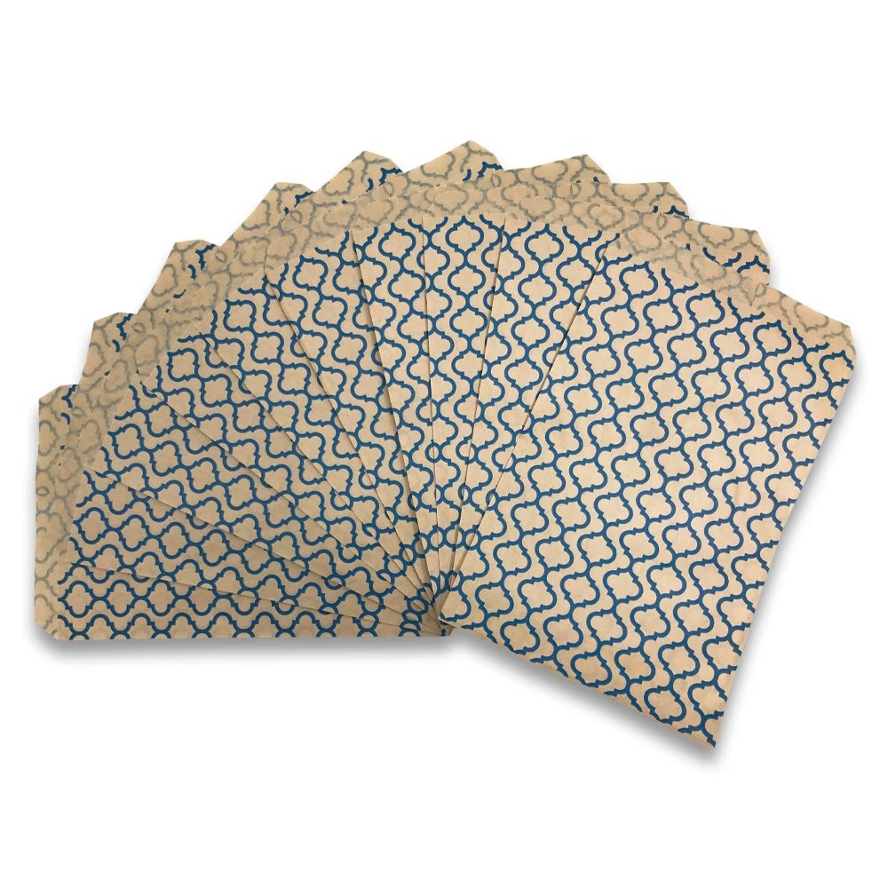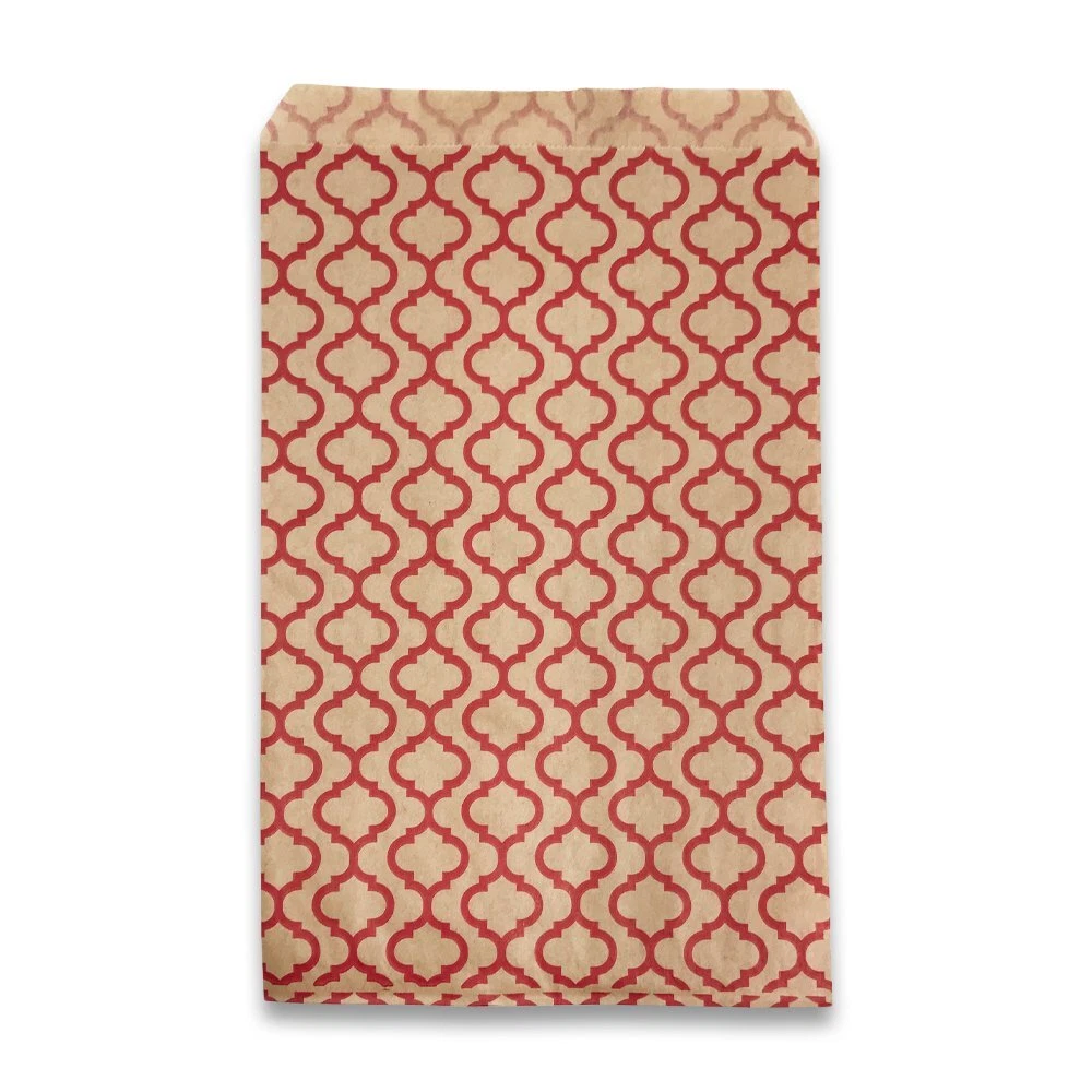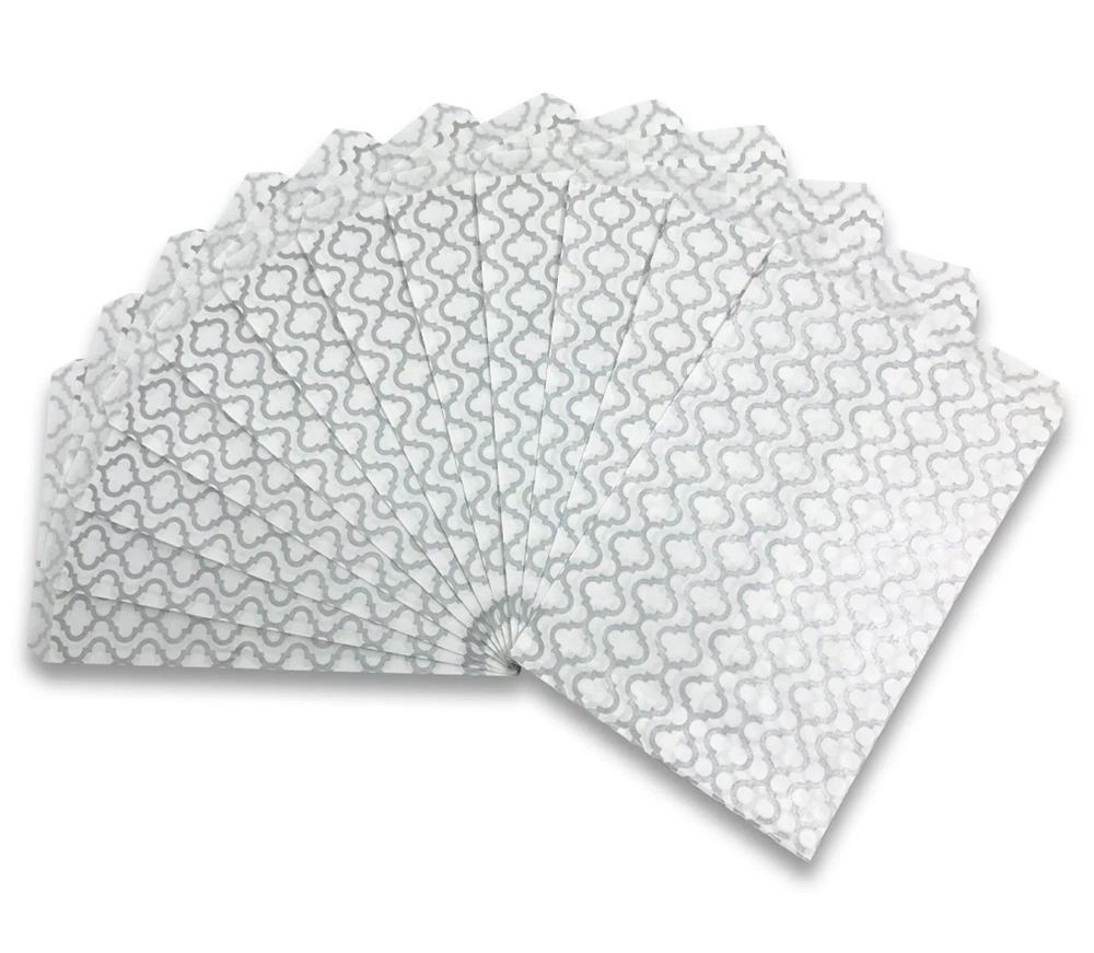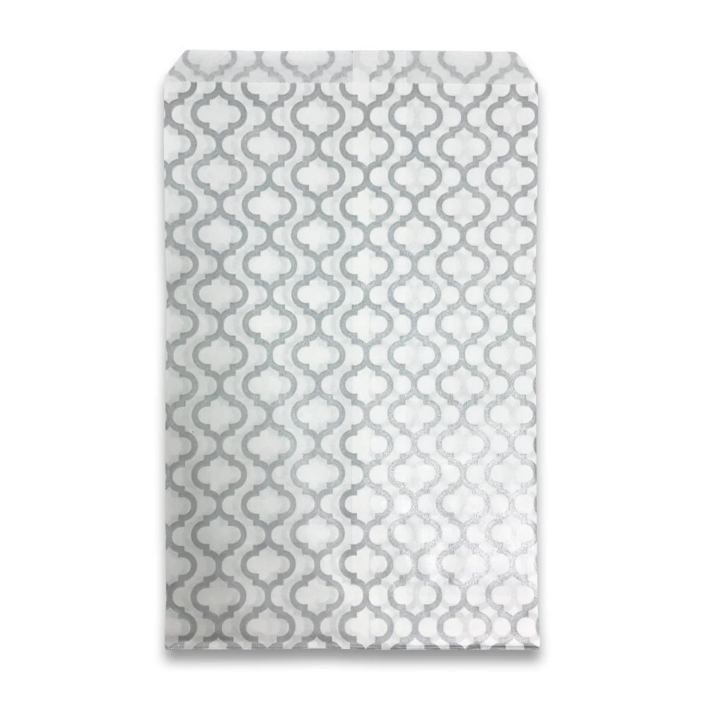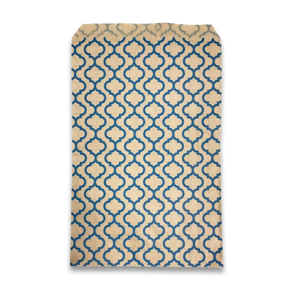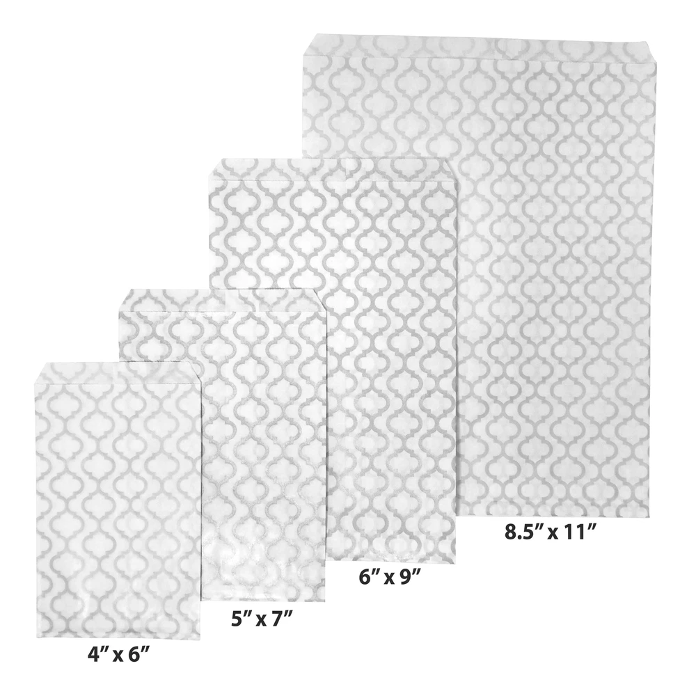 Trellis Dot patterned flat paper gift bags are a great choice for any retailer, party thrower or dedicated collector of flat paper gift bags. The eye-catching design is sure to draw attention from your family, customers, and friends. The 4 different sizes (4” x 6”, 5” x 7”, 6” x 9”, 8.5” x 11”) allow the bag to hold a wide variety of items, everything from jewelry boxes to baked goods to whatever party favors you have planned! We offer these bags in a variety of quantities to cater to your individual needs. Those who are having small events at their homes might prefer our 100 pack, while retailers who need them in bulk might gravitate towards our larger offerings. Each bag is coated with a semi-gloss finish for both aesthetics and to provide minor protection from tearing and piercing. These bags have no gusset which allows them to lie as flat as your choice of filling will allow, making them perfect for table settings or on top of display cases. We offer both white and kraft bag bases with patterns of silver, blue and white. We are sure to have a bag for every occasion! These Trellis design paper bags are stylish and eye catching! The perfect accent for party favors, small gifts and more. Sold in packs of 100, 200 and 300. Whether you’re buying in bulk or just need a few for a party this weekend, we’ve got you covered! Bags come in a variety of sizes: (4” x 6”), (5” x 7”), (6” x 9”), (8.5” x 11”). Find the right size for you! A great choice for crafts, merchandise, and small gifts. Use it for parties, weddings or storefronts! Our flat paper bags are designed to be more tear resistant than typical paper bags. They are also made to be easy to open and easy to fill.