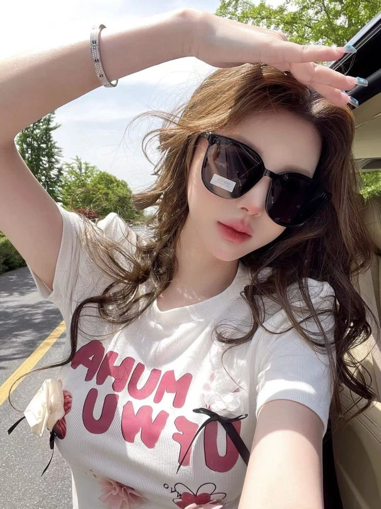 This pair of M family sunglasses, simple design without losing a sense of fashion. The pure black frame has smooth lines and a classic round outline, which can be adapted to a variety of face shapes. Dark gray lenses not only block the sun effectively, but also add a bit of mystery. Mirror leg with brand signature elements, fine details. Next to the sunglasses is M's signature pink packaging box and suede glasses box, the overall cool and handsome style, whether it is daily travel or fashion collocation, can be easily controlled.