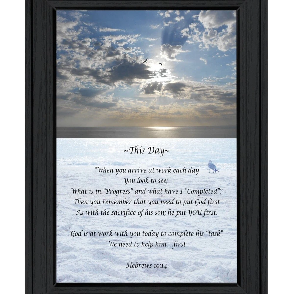 ME49A-405 "This Day" by the artisans of Trendy decor 4U; a decorative black framed print(11x15) of encouraging words for the day: the script says: When you arrive at work each day you look to see; What is in "progress" and what have I "Completed"? When you remember that you need to put God first ..... The print has a protective finish (no glass) and arrives ready to hang. Framed wall art, Decorative wall art, living room wall art Textured Artwork with a 'rolled on' acid free acrylic coating to create a canvas painting effect. No glass is necessary. Surface of the print has a fade resistant coating. Arrives Ready to Hang Woman Owned Business (WBE) Handmade in the USA Decorative Moulding adds natural beauty to the framed art. Free Shipping Over $49.99* Details TrendyDecor4U Farmhouse "This Day" Framed Print Wall Art - Coastal Product Description: ME49A-405 "This Day" by the artisans of Trendy decor 4U; a decorative black framed print(11x15) of encouraging words for the daythe script saysWhen you arrive at work each day you look to see; What is in "progress" and what have I "Completed"? When you remember that you need to put God first ..... The print has a protective finish (no glass) and arrives ready to hang. Framed wall art, Decorative wall art, living room wall art Textured Artwork with a 'rolled on' acid free acrylic coating to create a canvas painting effect. No glass is necessary. Surface of the print has a fade resistant coating. Arrives Ready to Hang Woman Owned Business (WBE) Handmade in the USA Decorative Moulding adds natural beauty to the framed art.