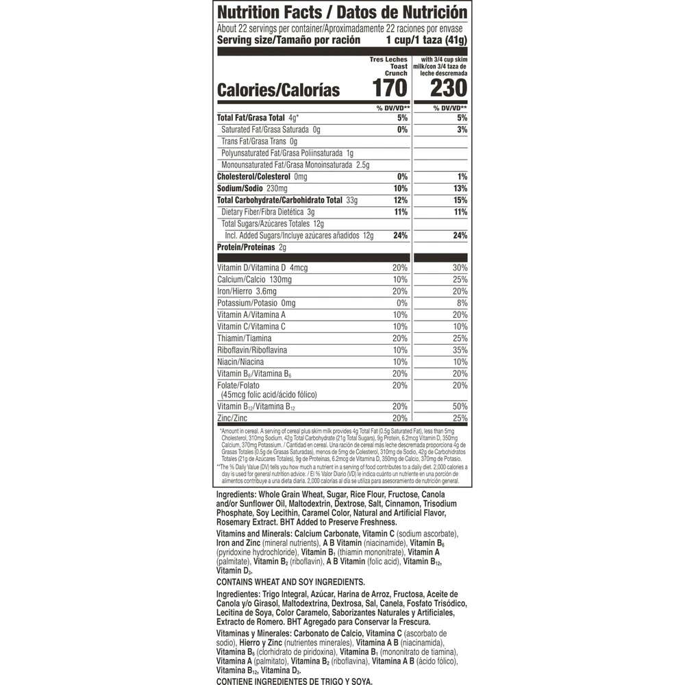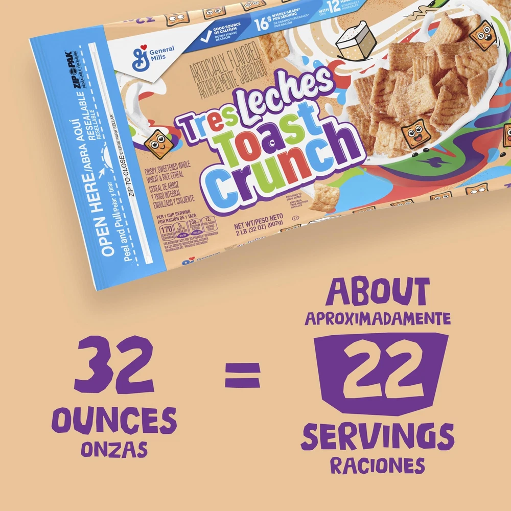 Tres Leches Toast Crunch Breakfast Cereal, Crispy Artificially Tres Leches Flavored Cinnamon Cereal, 32 oz Description Get off to an epic start with General Mills Tres Leches Toast Crunch cereal, inspired by the sweet and creamy dessert. Every crispy square is bursting with artificial Tres Leches flavor and blasted with CINNADUST, the mix of real cinnamon and sugar that makes your mouth happy. Enjoy artificially Tres Leches flavored sweetened whole wheat and rice cereal as a ready to eat breakfast food. Simply pour a bowl with milk and dig in to that satisfying crunch. Then slurp up the CINNAMILK, the sweet and awesomely tasty cereal milk at the bottom of your bowl. Tres Leches Toast Crunch breakfast cereal is made with 16g whole grain per serving (at least 48g recommended daily) and 12 vitamins and minerals, and is a good source of calcium. Make it a part of a quick and easy breakfast for teens, kids, and the entire family. Pack some in snack bags and enjoy this tasty cereal on the go. Add it to snack mix or cereal bars recipes for times with friends. Keep this bagged cereal in your pantry for mornings, and one to use as a crispy topping for pudding, cake, ice cream, and more. However you enjoy this crunchy Tres Leches cinnamon cereal, General Mills breakfast cereals are always ready to spread goodness from tots to grow- ups. Features: TRES LECHES FLAVOR: Crispy cereal squares combine the taste of cinnamon sugar and mouthwatering Tres Leches for dessert inspired deliciousness in every bowl WHOLE GRAIN BREAKFAST: Each serving provides 16g whole grain (at least 48g recommended daily), 12 vitamins and minerals, and a good source of calcium QUICK BREAKFAST OR SNACK: Try it with or without milk for mornings, or serve it as easy teen or kids snacks that spark smiles every time SWEET TREATS: Tres Leches cinnamon cereal makes a delicious addition to homemade cereal bars, party snacks, ice cream toppings, and more CONTAINS one 32 oz cereal bag of Tres Leches Toast Crunch Cereal Product Details: Brand: Cinnamon Toast Crunch Flavor: Tres Leches Age Range (Description): All Specialty: Whole Grain Unit Count: 32.0 Ounce Product Dimensions : 10.6 x 19 x 4 inches; 2 Pounds UPC : Manufacturer : GENERAL MILLS SALES INC. Country of Origin : USA Handling We will ship all orders within 3 business days of payment. Delivery We do not ship outside of the Continental US. Feedback We take our reputation seriously, we buy and sell online, so we understand the value of trust. If you are unsatisfied with your order, please contact us and we will work with you to resolve it to your satisfaction.